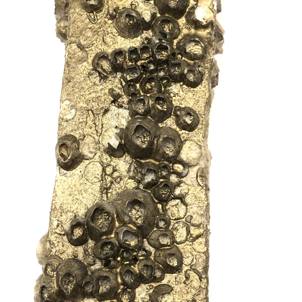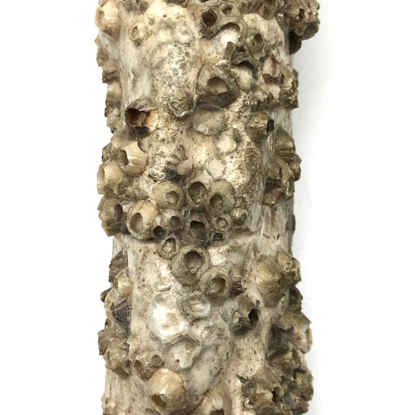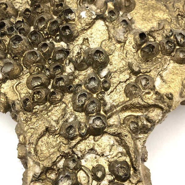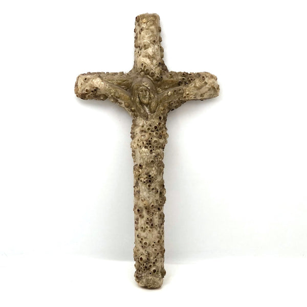 I have no idea the story behind this one, or how it came to have barnacles all over it, but I'm pretty happy that it exists! Jesus and his cross seem to be made of ceramic material or perhaps some sort of concrete (it's not especially heavy though), which I'd have to think was immersed in the sea for some time such that these barnacles would grow all over it. And at some point in the process it was painted gold, too, which is most pronounced on his face and upper arms, but appears all over. What a thing! Happily, there's a wire loop at the top of the back for hanging it.