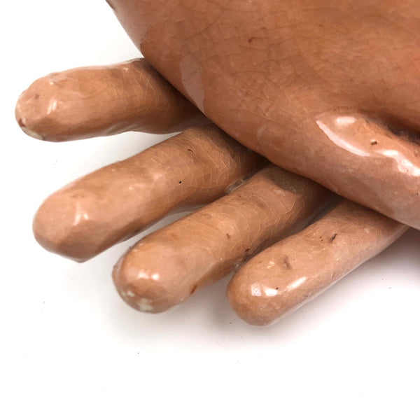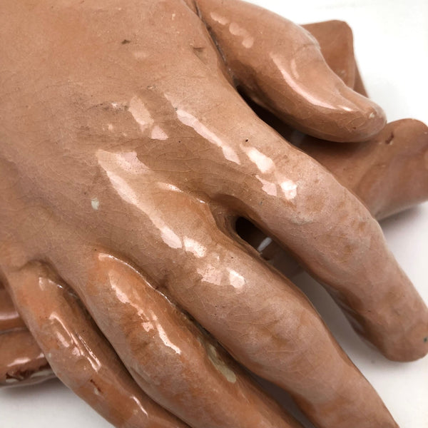 Fun, and pretty excellent as a tabletop sculpture, which can be flipped to show either way, giving one or the other the upper hand! And I do like to think of these as the hands of two different people, engaged in an an ongoing negotiation... which makes me wish there were a whole series of these with the hands arranged in different gestures and postures... with this pair (one connected piece) seeming to signify 'calm down' to me! Made of clay by molding slaps around a real pair of hands I preseume, hollow, with shiny, skin tone glazing.