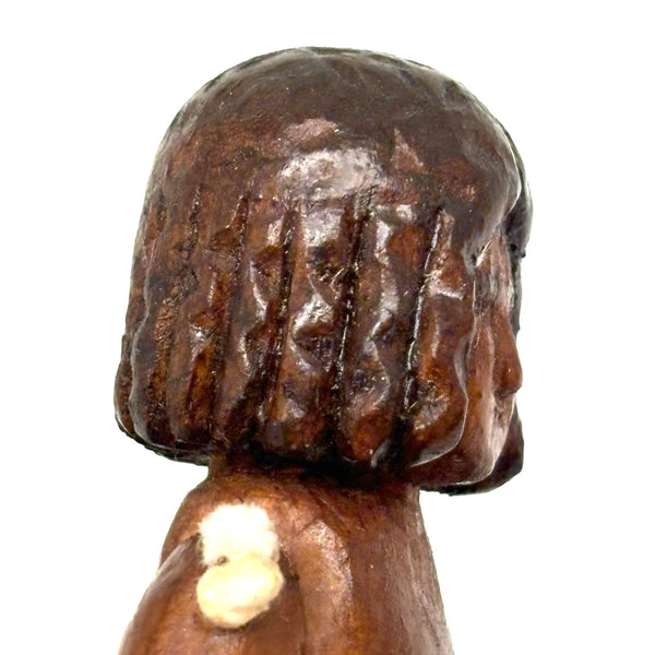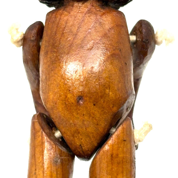 Such a funny little one--I want to call this a carved baby doll, but with a full head of hair, she seems well beyond the toddler stage! The carving of that hair is quite wonderful, and her carved face, with subtly painted red lips, is too. And a bit funny how she's carved to sit with her legs spread wide. I believe she was likely modeled after a "Frozen Charlotte" china doll--a folky homemade version carved of wood. With string ties at her joints and varnished surface. C. 1920s-40s I would guess.