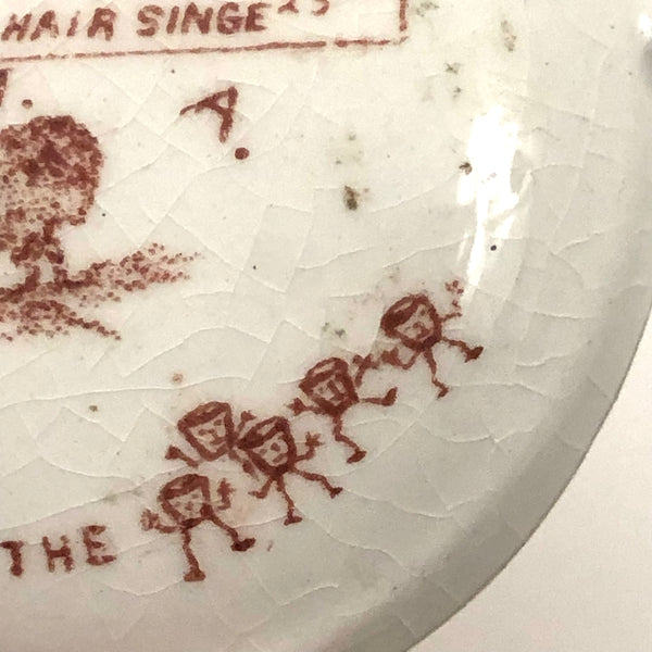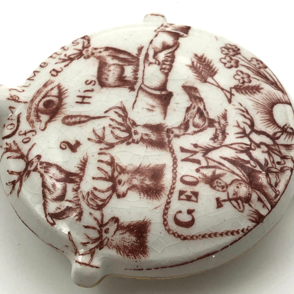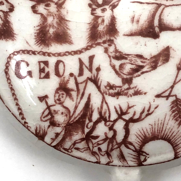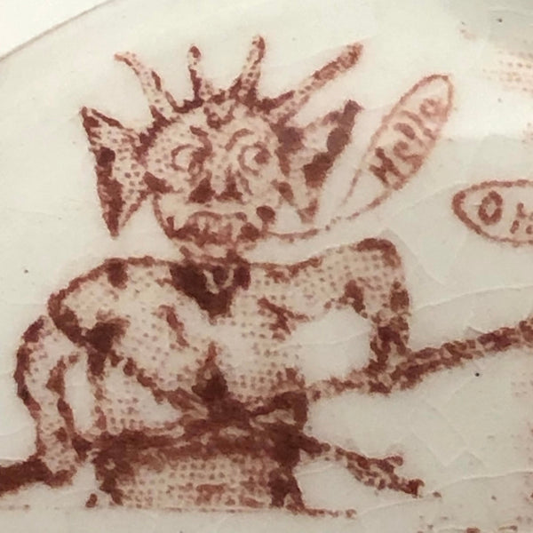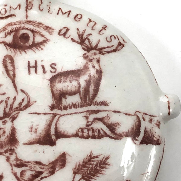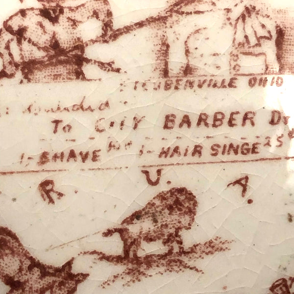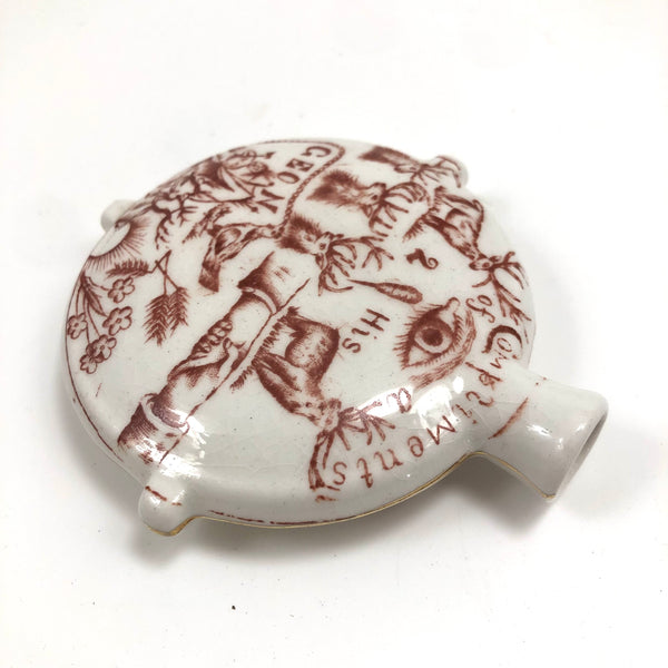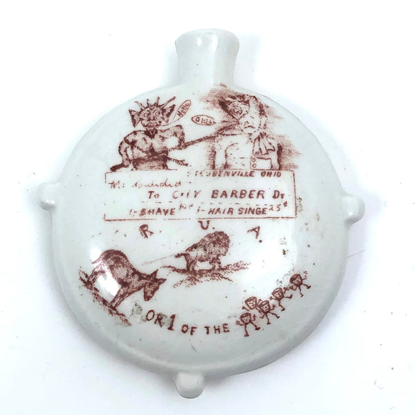 Another curious one, which, as a lover of rebuses, there was no way I could resist--though I'm not the least bit good solving them! I turned up a blog post devoted to miniature ceramic canteens, explaining them as a phenomenon of the Grand Army of the Republic (G.A.R.), a fraternal organization found in 1866 and composed of Civil War Union army/navy/marine veterans. (The miniature canteen form referencing canteens carried in combat.) And indeed, the all seeing sort of eye and shaking hands on the face of this one are clearly fraternal symbols--though what all these stags are about, I could not say! And then on the back, which shows a bit more wear, a devil with pitchfork and what looks like a wounded soldier ("Hello...O Hell")!, certainly evoking a veteran's experience. Lots more that is somewhat cryptic, to me at least; (R U A a buffalo (?), ass, or one of the gang??? And with a reference to Steubenville, Ohios, the home of the Ohio Department of the G.A.R., which was quite an active chapter. An interesting little piece of American history whatever the case, and a rare one, c. 1890s.