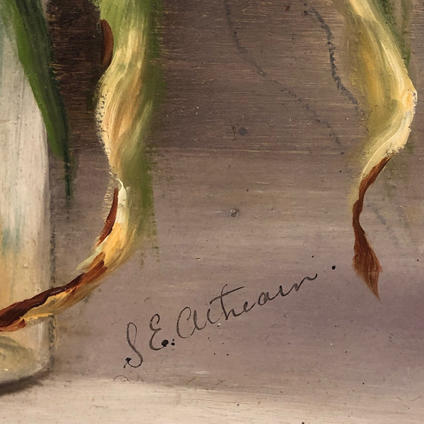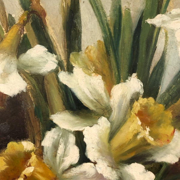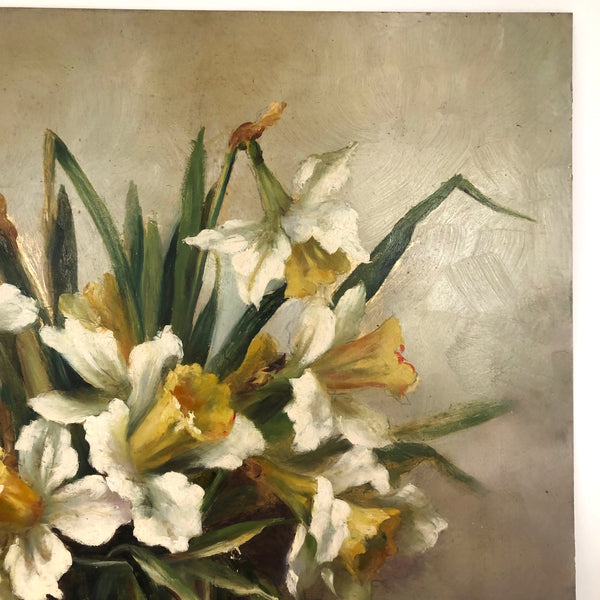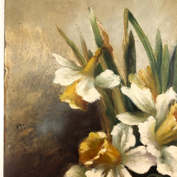 SOLD Daffodils in Glass Jar, Earlyish 20th C. Signed Oil on Tin Painting