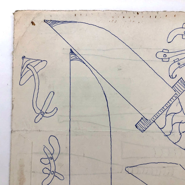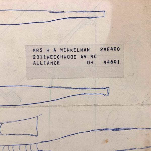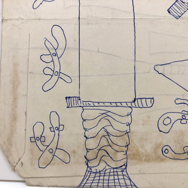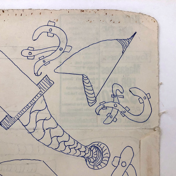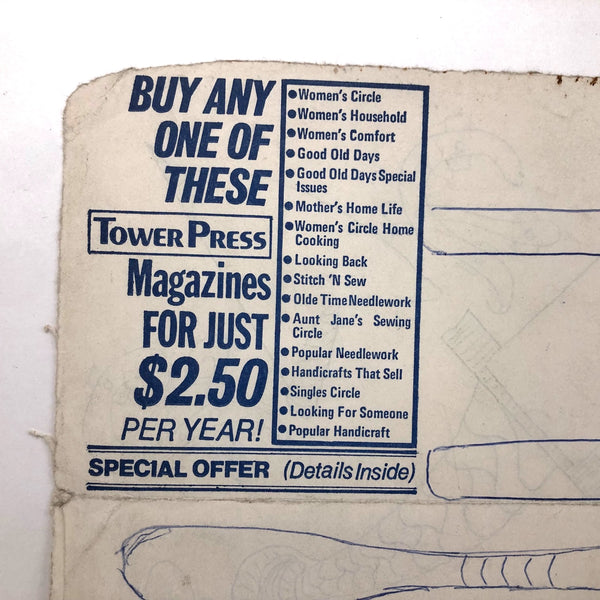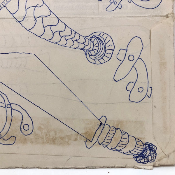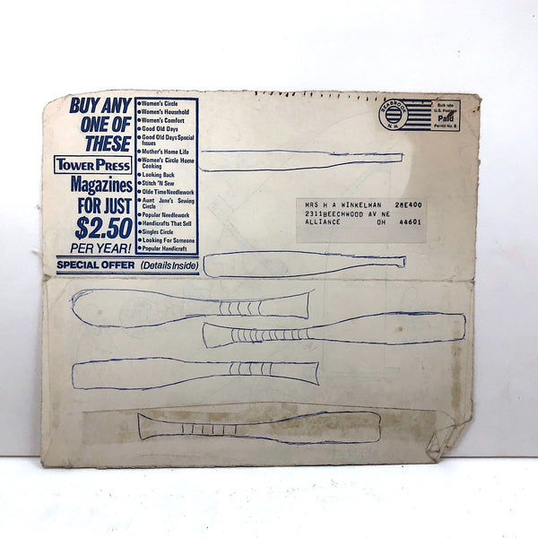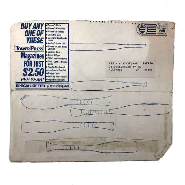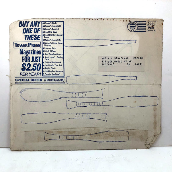 Self-taught Ohio-based artist Lewis Smith (1907-1988) is best known for his drawings of diners, women boxers and wrestlers, and trains (it was a lifetime railroad pass that allowed him to travel beyond the family farm in rural Ohio to pursue his other subjects), but I always like the unusual ones, and the most casual sorts of drawings, so jumped immediately on this one, which reminds me of tattoo flash art, too. Daggers and sort of anchor-like forms on one side, and baseball bats on reverse, on a Tower Press magazine advertising mailer, sent to Mrs. Winkelman in Alliance, Ohio (perfect!) Everything about this, down to the last detail, does it for me.