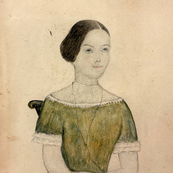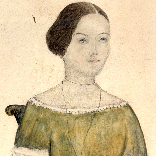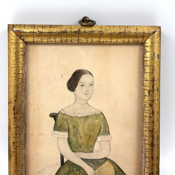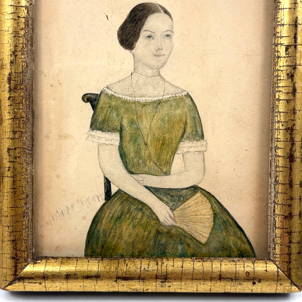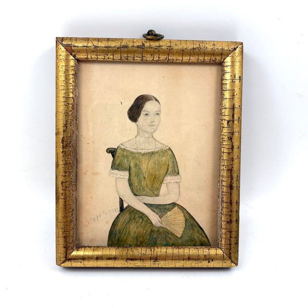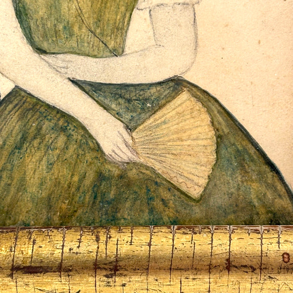 I purchased this one from a dealer in North Carolina, and she does seem a bit of the Southern(ish) belle with fan in hand, though I am not certain of her origins. Later 19th century I believe, in what appears to be her original gold gessoed frame, suiting her perfectly. Naive but also very delicately rendered, with finely drawn features and wonderful painterly application of the green of her dress. And with her eyes cast slightly, upward, perhaps in reference to her faith, but seeming to me more as if a subtly expressing exasperation at having to sit in such a poised and self-contained manner!