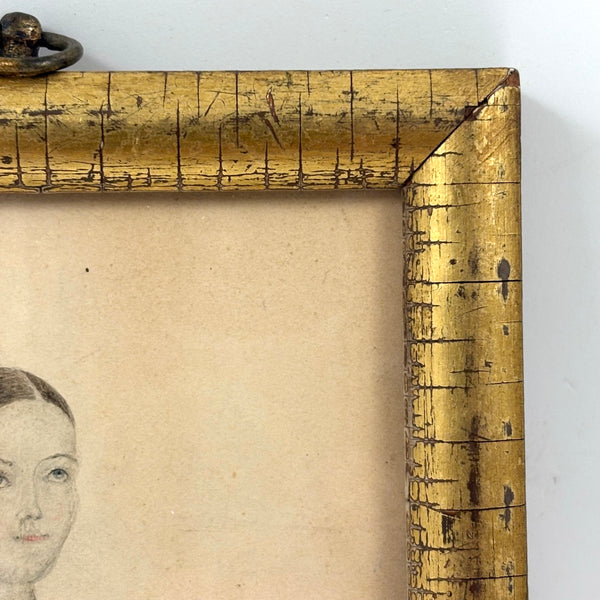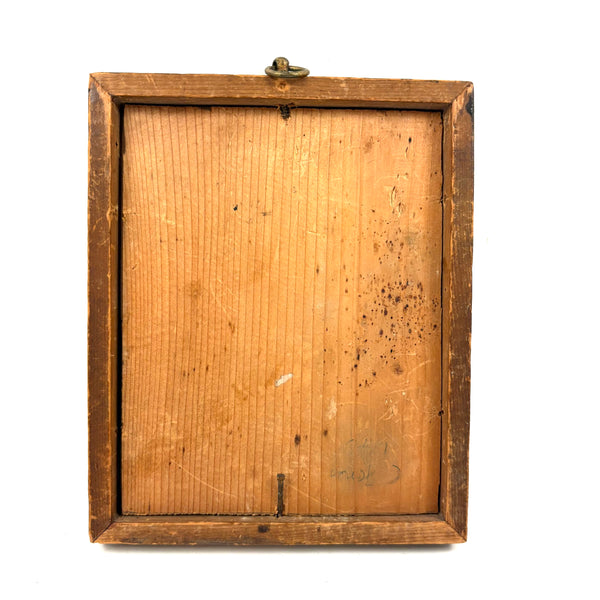 5 7/8" x 4 3/4" framed, under glass, in original antique frame with wood back and loop at top for hanging. Good antique condition, and as with most everything much lovelier in hand!