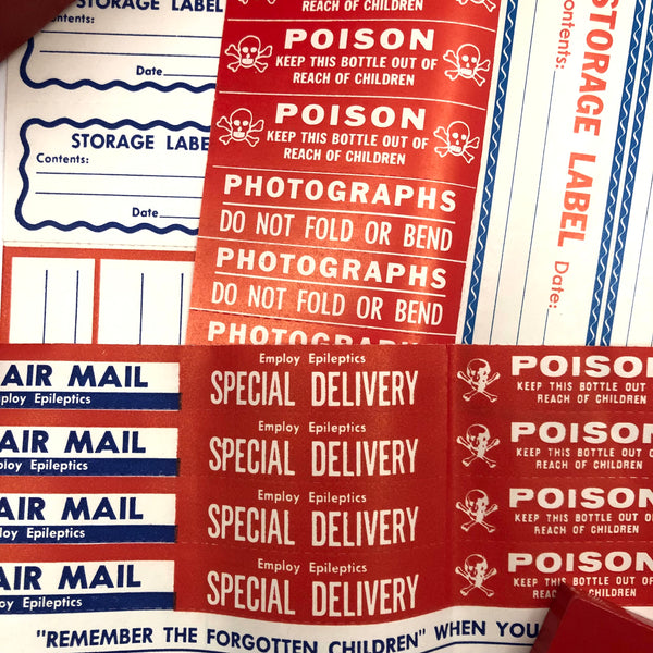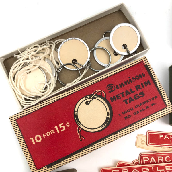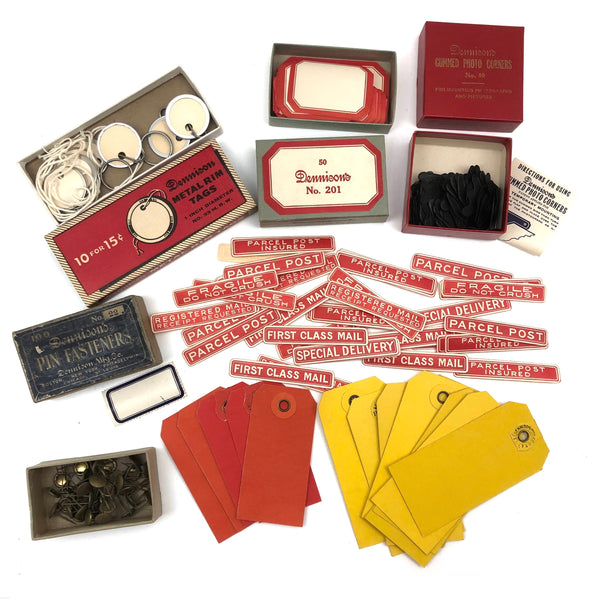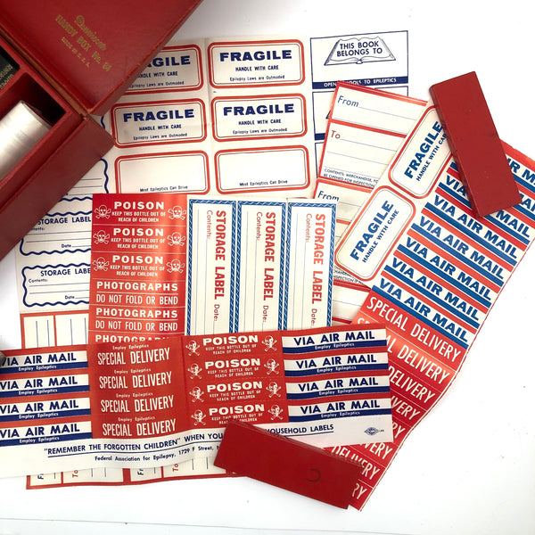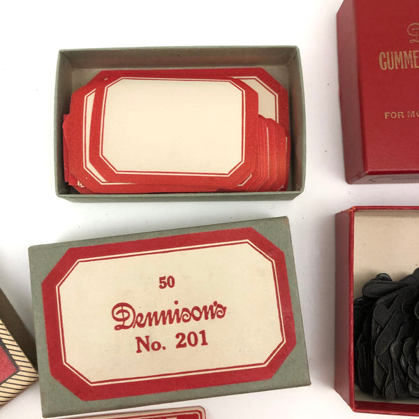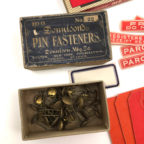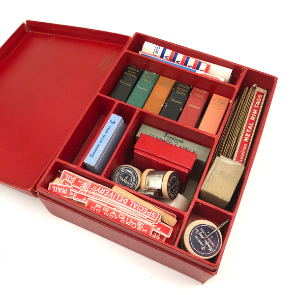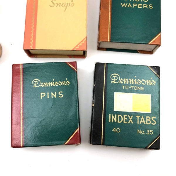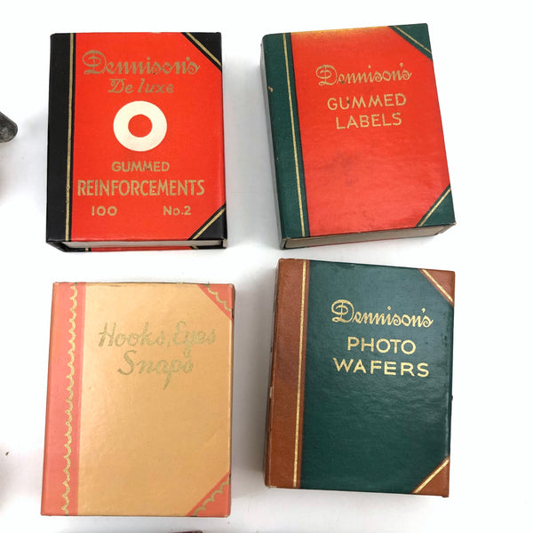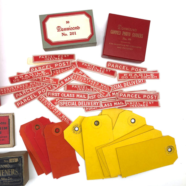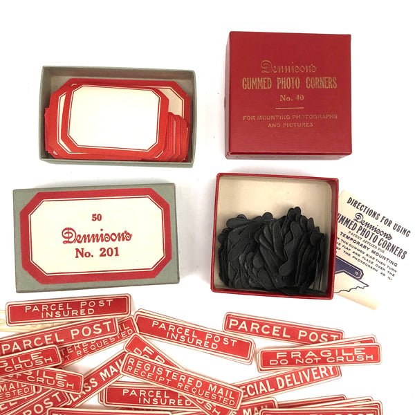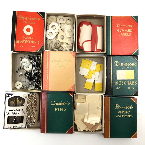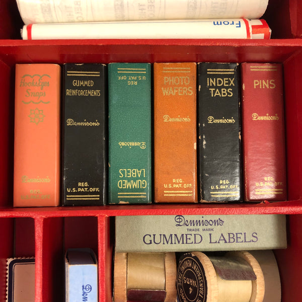 The Dennison Manufacturing Company (1844-1990) which produced this "Handy Box No. 64," c. 1920s-30s I believe, was a Framingham, Massachusetts based paper products manufacturer and international leader in the stationery market. And if this was no 64 in a series of boxed kits, seems to me one would have everything one could every possibly need to complete every task imaginable and keep themselves busy for the rest of their lives if they had the whole series! I'm a sucker for good packaging and boxes inside of boxes--looking at this fills me with a sense of serenity at its organization, and also with the want to write letters, create albums, and box up gifts. Seems most of the original contents are present: postal labels (including poison, fragile, special delivery, do not bend, etc), photo corners and wafers, pins and needles, paper fasteners and hole reinforcements and mending tape, and colorful labels and tags of various other sorts. Many of them housed in little boxes that look like books, enhancing the sense of the box as a library of solutions. I just could not resist, and these seem pretty scarce to find.
