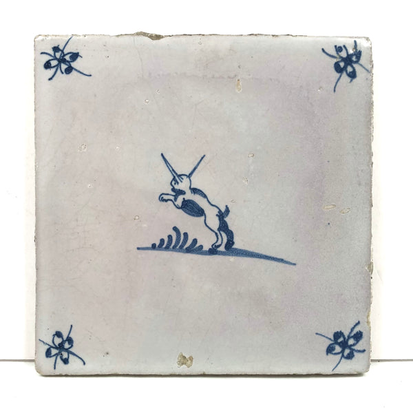 I purchased this one from a Dutch dealer who maintains an outpost at a New Hampshire antiques store that I frequent, and so, not surprisingly, knows his Delft pottery. (One finds older tiles, as well as newer ones, in this manner, but this one I have on good authority is 19th c). For me of course it's all about this creature, looking very much like a dog with devil horns! One often sees bounding rabbits on these Delft tiles, which perhaps this was meant to be, but the very long, very pointy ears make it seem like a different sort of creature entirely, with the front paw looking like a sharp and grabby claw, too!