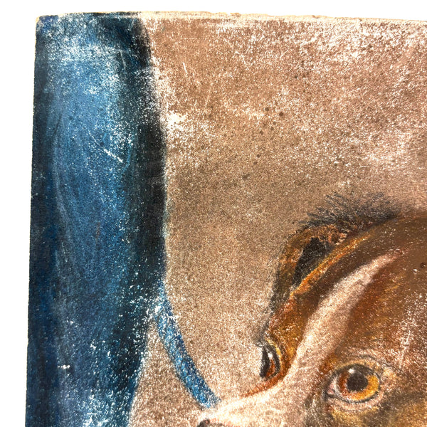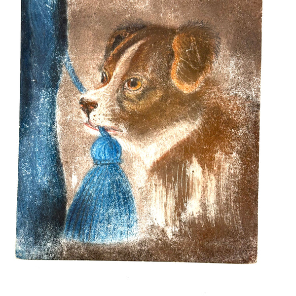 This 19th c. pastel drawing popped from all the way across the room--that blue is just electric, and how much better for that wonderful tassel to be hanging from the mouth of this very charming dog! I love everything about this, which I take for a sort of "sandpaper" drawing, made by adding marble dust to the surface; there is not much shimmer to it, but there is a definite sandpaper like texture to the surface, and it is similar manner to a few colored sandpaper drawings I've had.