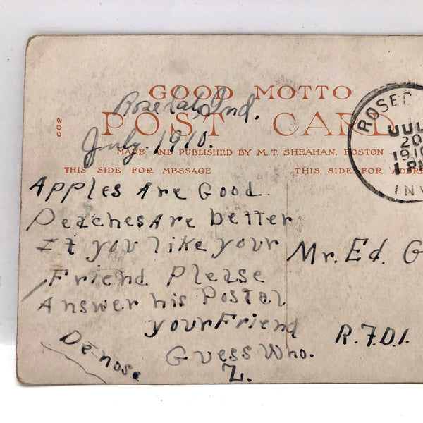 I couldn't resist the graphics--and most of all the sentiment!--on this novelty postcard created by M.T Sheahan in Boston, 1907, which I think would be the perfect thing to hang above one's desk. The message written on the backside (in great hand-writing, and sent in 1910) was a happy surprise: "Apples are good. Peaches are better. If you like your friend please answer his postal." And then a "guess who. Z" plus the curious "De-nose" at bottom!