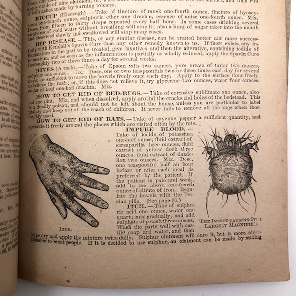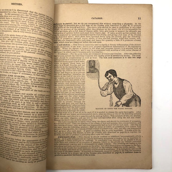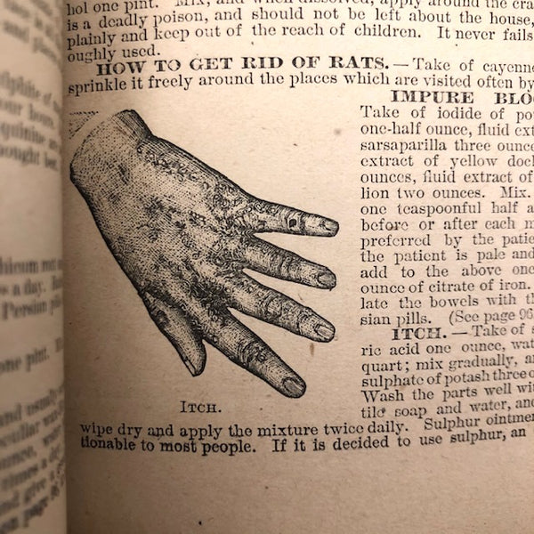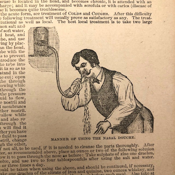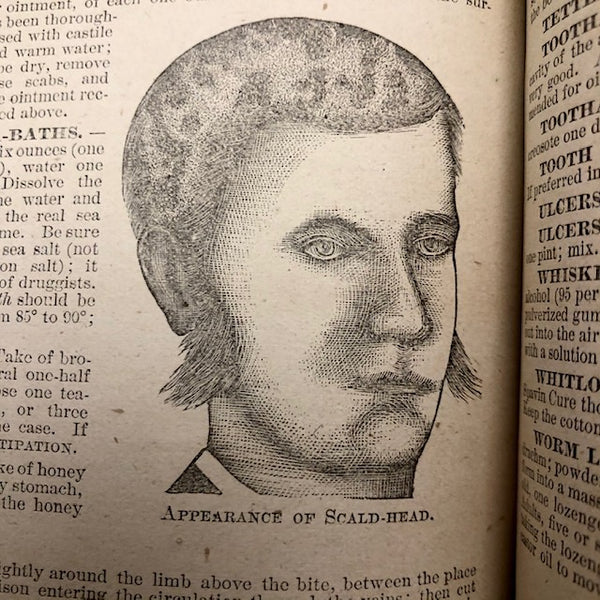 The front and back covers of this copy of "The Doctor at Home", published by B.J Kimball of Enosburgh Vermont in 1883, are tattered and loose, but the pages are in pretty good shape and I think it's really fun. The first half is dedicated to treating the ailments of humans, and the second half to horses. I really love its alphabetical organization within each section, juxtaposing Barber's Itch with Blood Poisoning, Rats and Ringworm, Shingles and Snakebite. The illustrations are especially great, usually several per page, showing everything from club foot, to how to use a nasal douche, to how to tell the age of a horse by its teeth. Plus some letters from readers at the end. Hard not to get sucked into this once one begins reading!
