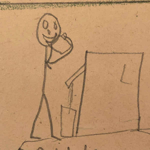12" x 9", pencil on construction paper. Paper is somewhat brittle but overall good condition, with what looks like an earlier attempt erased at upper left.