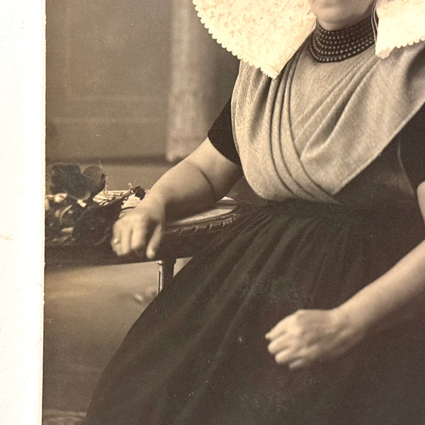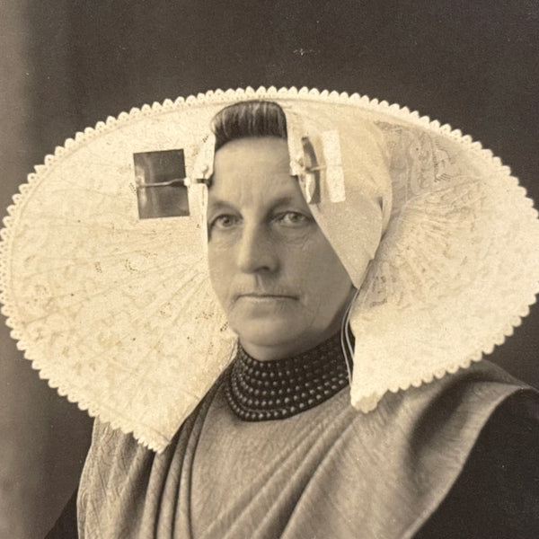 A 19th century watercolor portrait last week of a Dutch woman in traditional Friesland style "Oorijzer," (or "ear iron"), and then this early 20th century photo portrait of a Zeeland woman in one of a slightly different sort has me wanting to carve out some time to do a deep dive into these very particular traditional head ornaments! When I found this RPPC I did not yet know about Oorijzers, and what struck me was how those metal plates to either side of this woman's forehead looked like devices with some sort of scientific purpose--as if to harness energy, or attract signals from beyond! And I find something really wonderful about the combination of those very sci-fi seeming, mirror-like plates and her very architectural, finely handmade lace collar--feels as if past and future at once, and rather beyond time and place entirely. And her face and presence is just right for transcending!