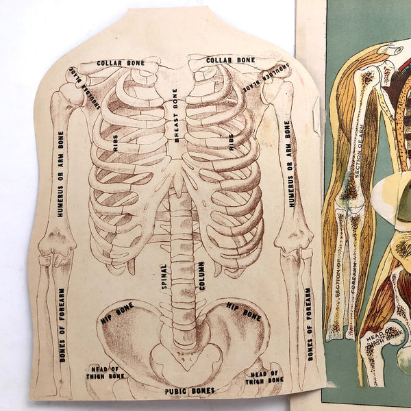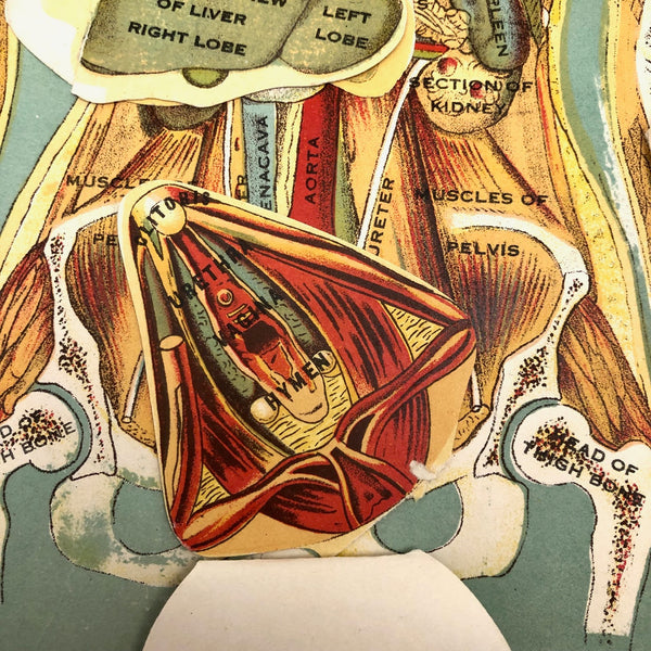 One of three c. 1901 fold out anatomical illustrations, all found together but which I'm listing individually. I believe this one, and likely all of them, came from E J Stanley's "Library of Health," first published I believe in 1901, and again in 1916. This one depicts the body's skeletal and muscular systems and its internal organs, folding out one by one, with this one including the female reproductive organs.