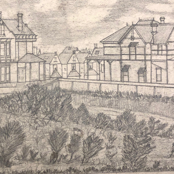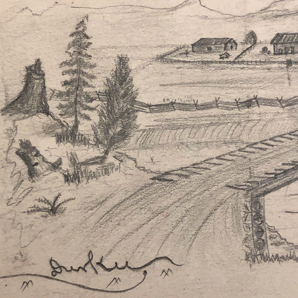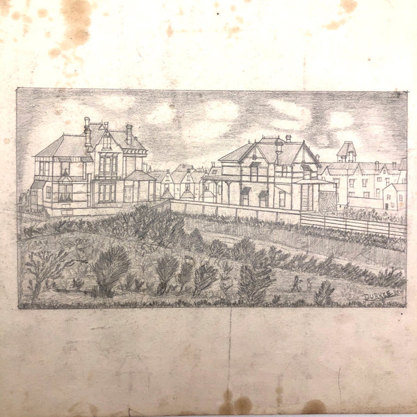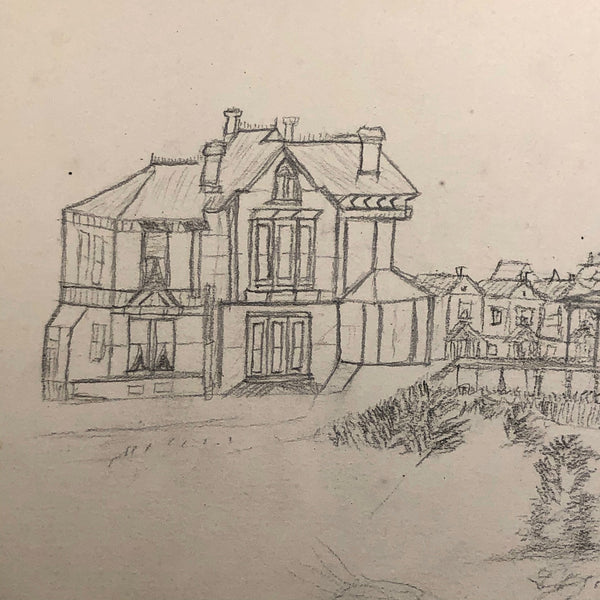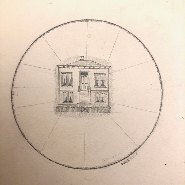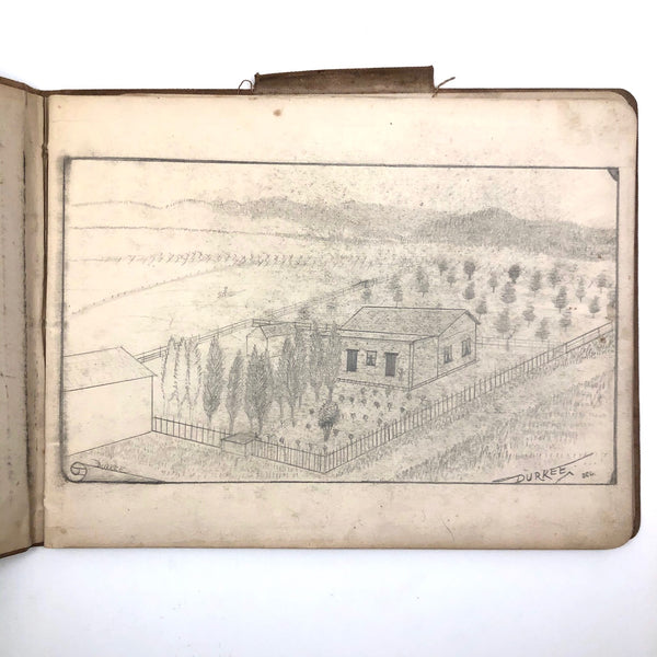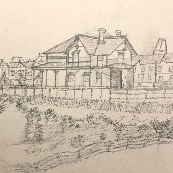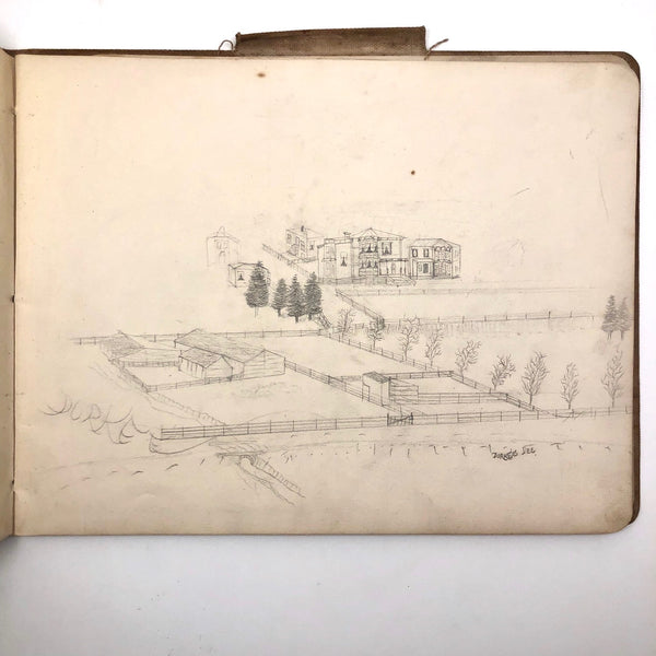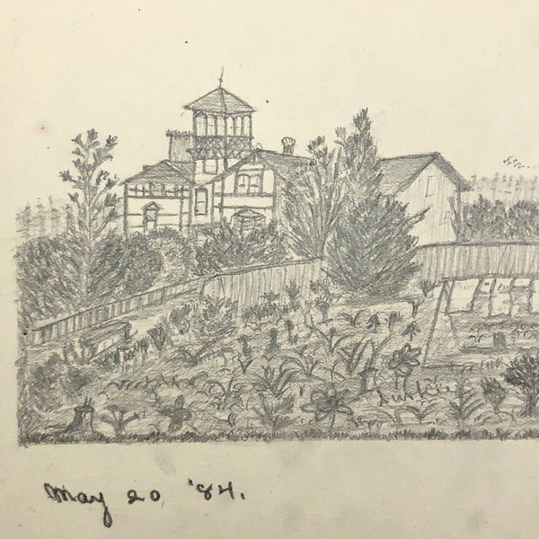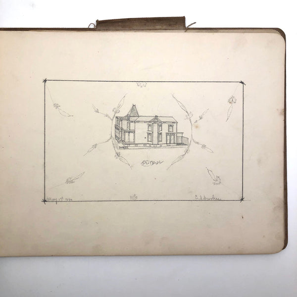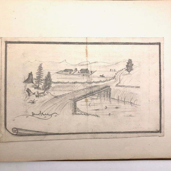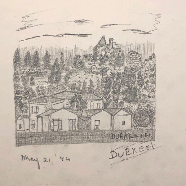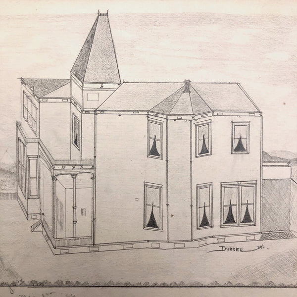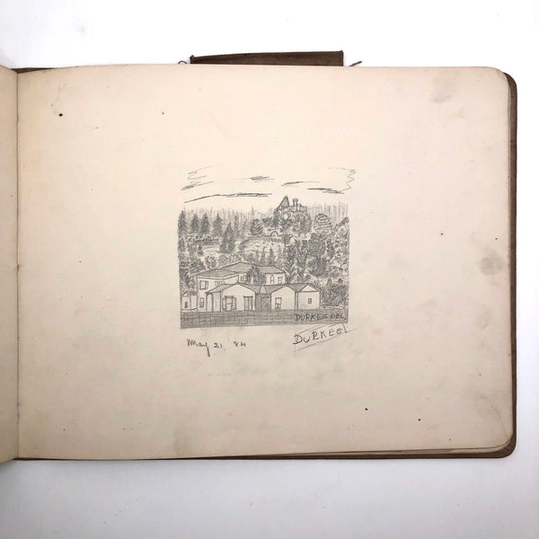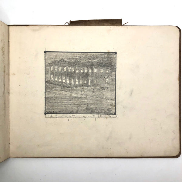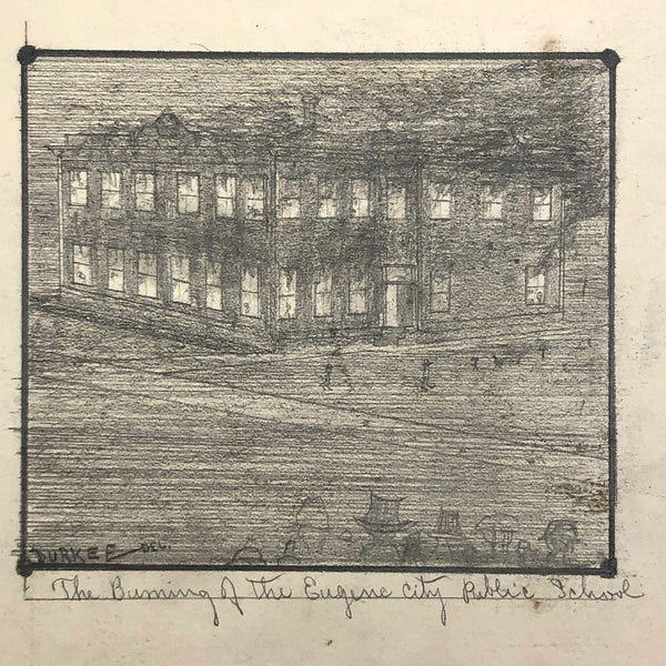 A little research tells me that the Durkee family was important in the settlement of Oregon, with the first members of the family moving from New England to San Francisco during the gold rush in 1850, and later settling in Oregon. There, it seems they were responsible for a fair amount of early development, including the establishment of Durkee, an unincorporated community in Baker County, Oregon, so named in 1883 named when the railroad bought its right-of-way from the Durkee family. This sketchbook was signed by Elton Silas Durkee (1871-1927, from what I can find) who notes his location as Portland Oregon, though it includes a drawing of the Eugene City Public School fire, and I do wonder if some of the estates pictured were of early homes in and around Durkee as well. In addition to listing this sketchbook here, I thought I'd see if I might try to contact some Oregonian historians to see if any interest as well!