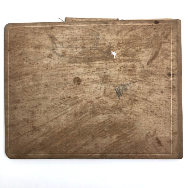 8 1/2" x 11" x 1/2". Overall good condition, with wear to the cover and spine and a lot of smudging to the first inside drawing, and elsewhere some scattered stains and smudges, but most of the drawings are still bright and crisp and clear. There are two loose drawings (pictured last in photos) that show more damage.