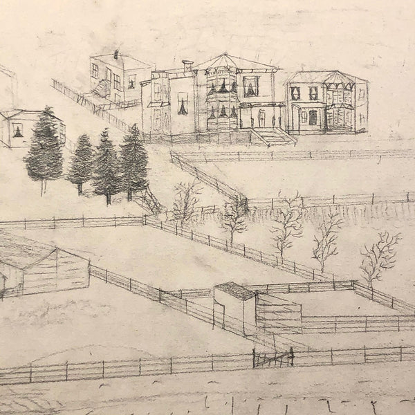 Photos document all pages excepting a few blank pages at the end. Drawings are all done in pencil, and on the front but not backs of the pages. I love the amount of information they capture, detailing houses, estates and surrounding homes and landscapes. My favorite drawings are the old later on in the bunch where his hand loosens up and he seems to find great joy drawing flowers and trees and clothes hanging on a clothesline! A pretty cool piece of history.