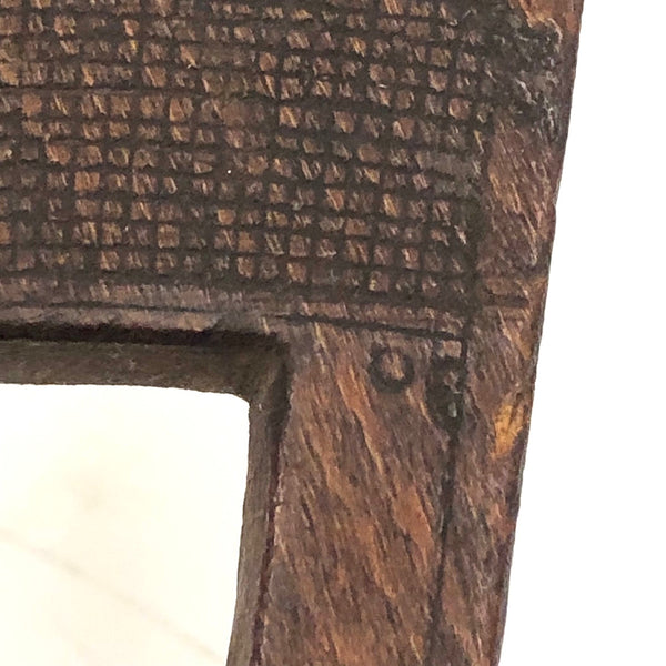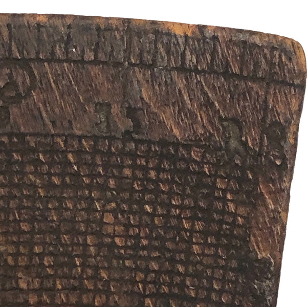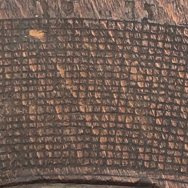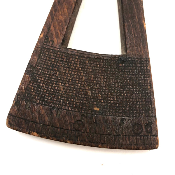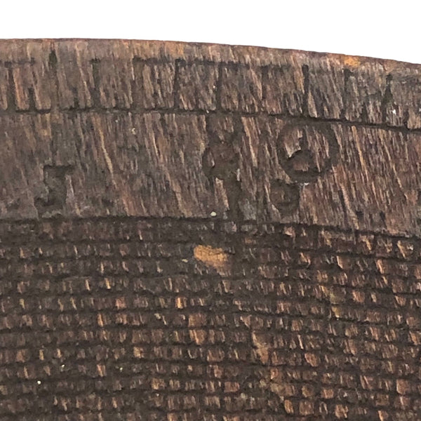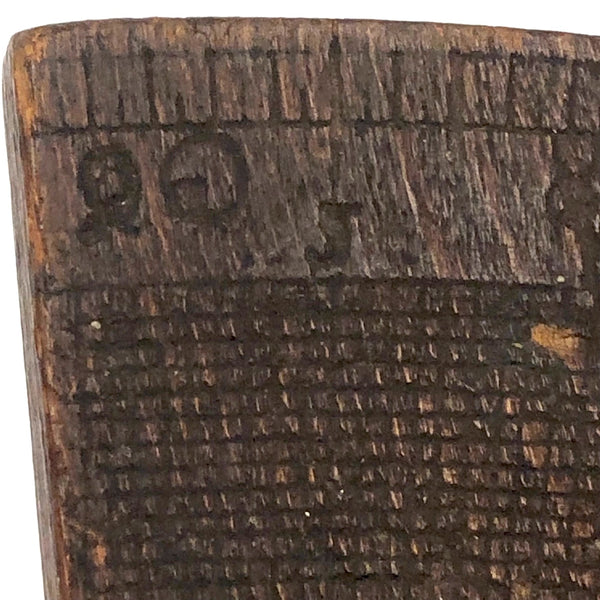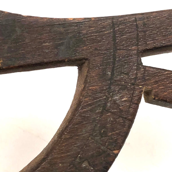 I really love measuring tools of all sorts, and know there are a few of you out there who do, too--and this is such an old one, I could not resist. I am quite sure it is a piece of a navigational instrument, and believe part of a sextant, used to measure the angle between an astronomical object and the horizon for the purposes of celestial navigation. (A moveable arm, probably made of brass, would have attached to the corner from the back.) Really rare to see one of these hand-carved of wood, here it looks to me with angle measures carved in along the far edge, 0-20, numbered in 5 degree increments. Plus other marks and notations along the near curve that I can't quite decipher. 17th-18th century I am confident, with a monograph carved into the reverse. What especially makes it for me is all that carved crosshatching! Feels quite evocative of the "Age of Discovery."