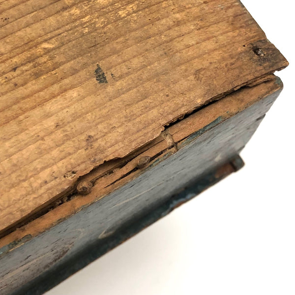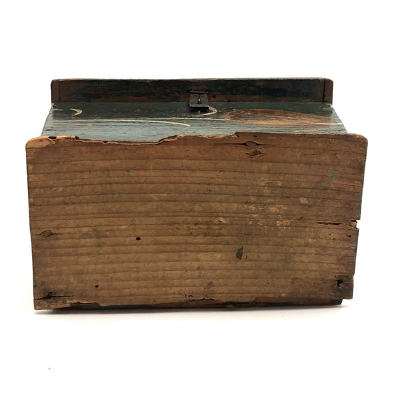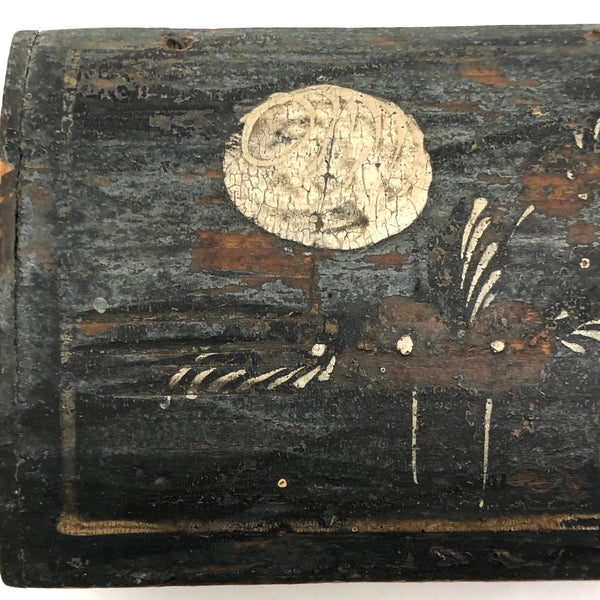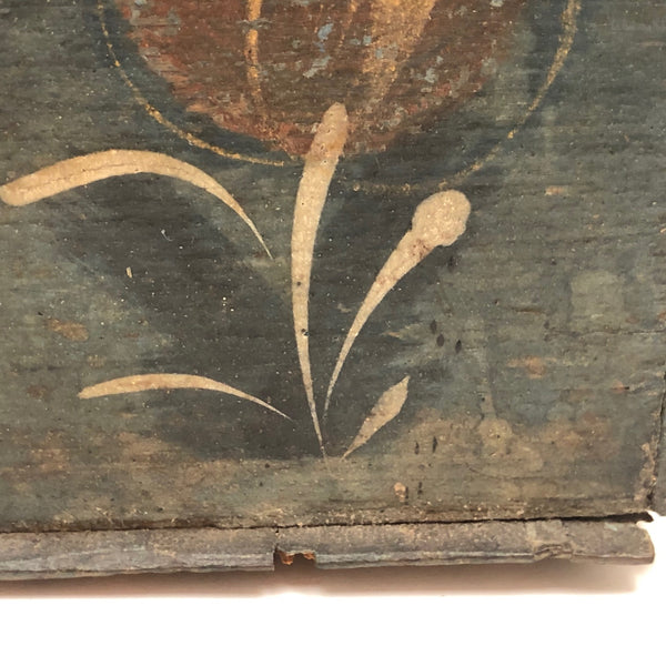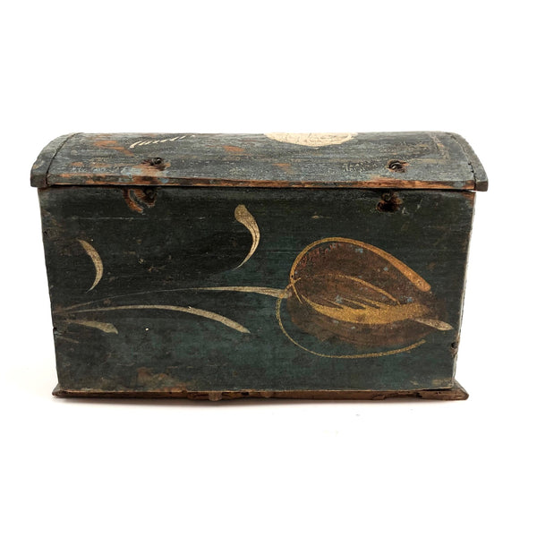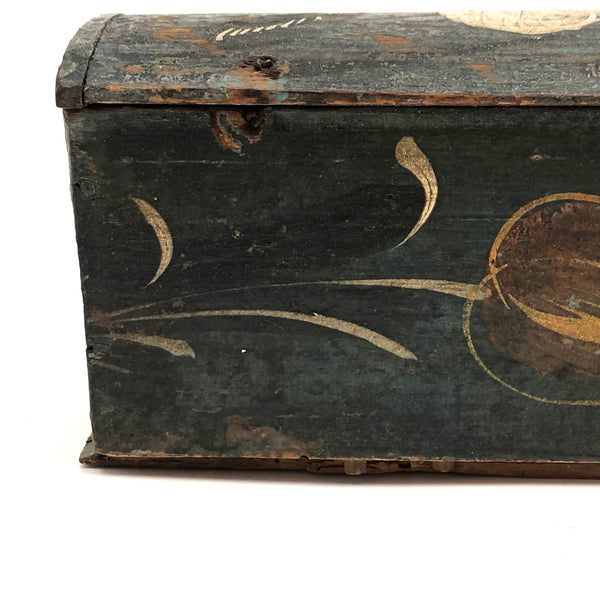 A bit of loss to the wood along the front bottom edge of this miniature dome lid painted chest, but a rare and lovely and special feeling thing. I found this one alongside a second painted with trees and houses that I listed and sold several weeks ago, both I believe Northern European. Wonderfully painted with tulips on every side against an interesting dark blue with a little green it it, with smaller flowers and what looks like a large white sun or moon on the domed top. With original wire hinges and iron latch on front.