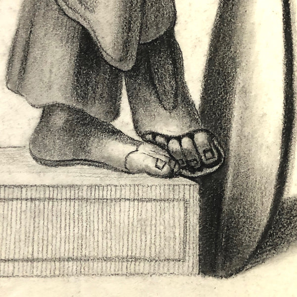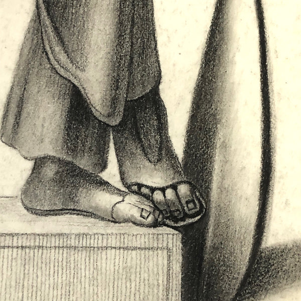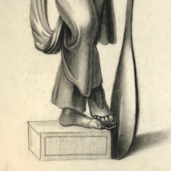 This drawing came from a portfolio of academic charcoal drawings, dated between 1800-1813, discovered in Paris by a Belgian seller, who I purchased this one from. Especially because of the oar she is holding (which makes me especially love this), I believe the drawing may be based on a late 17th century caryatid by Raphael painted below the fresco of 'The Meeting between Leo the Great and Attila' in the Stanza di Eliodoro in the Vatican, who is generally interpreted as representing Marine.