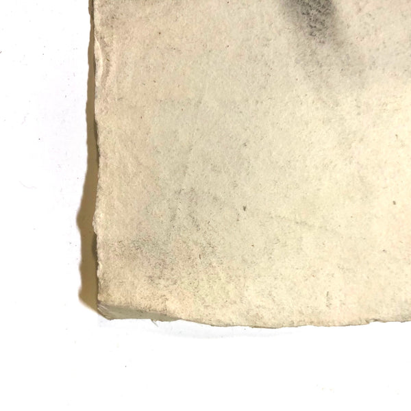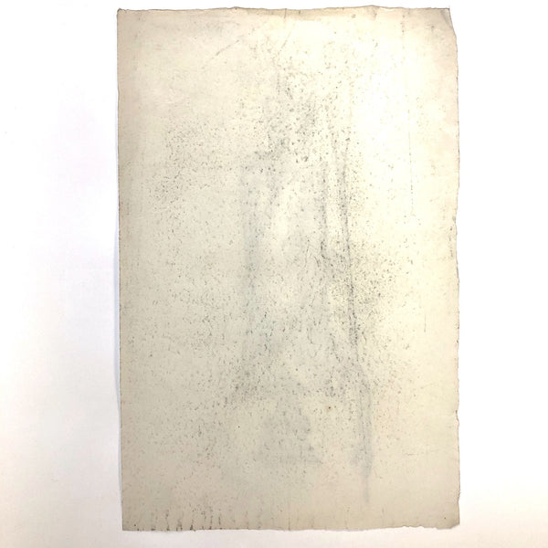 18 3/8" t x 12" wide. Very good condition; some scattered light dirt, minor, a little wear around the edges and very minor traces of wrinkling, and two tiny holes in the top corners. The back shows a bit of charcoal, likely from another drawing it was stacked atop; there is no foxing anywhere. Really great. Photos show the paper as a bit yellower than it is; it is really pretty bright white.  Shipped flat.