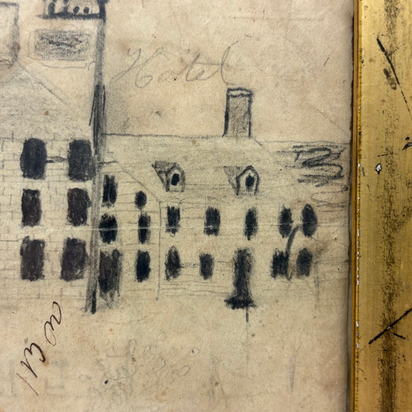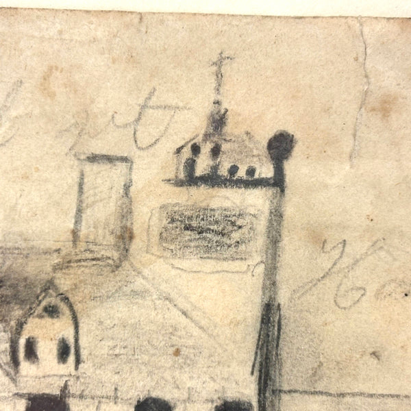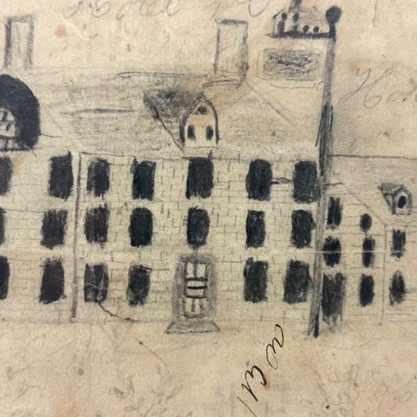 I found this drawing digging through an old pile of papers at Brimfield, and you can bet I dug through that and every box near it hoping to discover others similar (sadly not.) Nothing I love more that an early naive American drawing of a architectural structure like this, surely done on the page of an antique school ledger, early 19th c. I believe. The best rich black on those windows, soft around the edges, with "hotel" written twice above it, to either side of that wonderful little church on high.