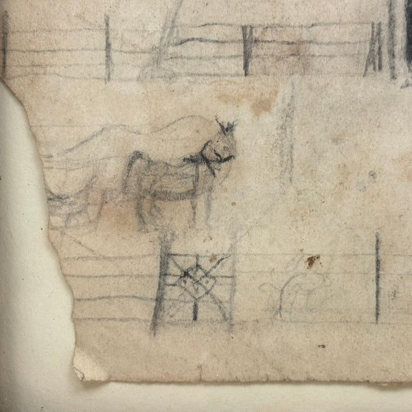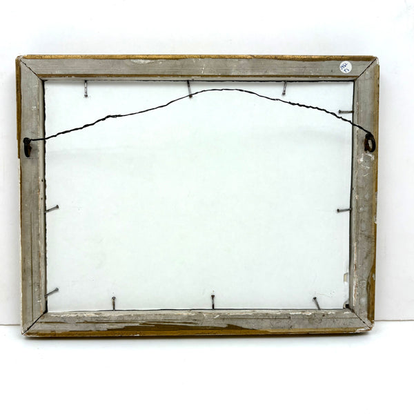 Framed: 9 1/4" x 7 1/4". Paper: 7 3/4" x 4 7/8". I framed this one to keep it safe and because I really love it--and the frame itself is a great one, of a hard to find smaller size. Losses to the left edge and bottom of the paper as evident. Simply mounted by two small pieces of clear archival tape to a piece of archival board; easily removed.