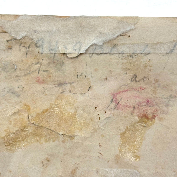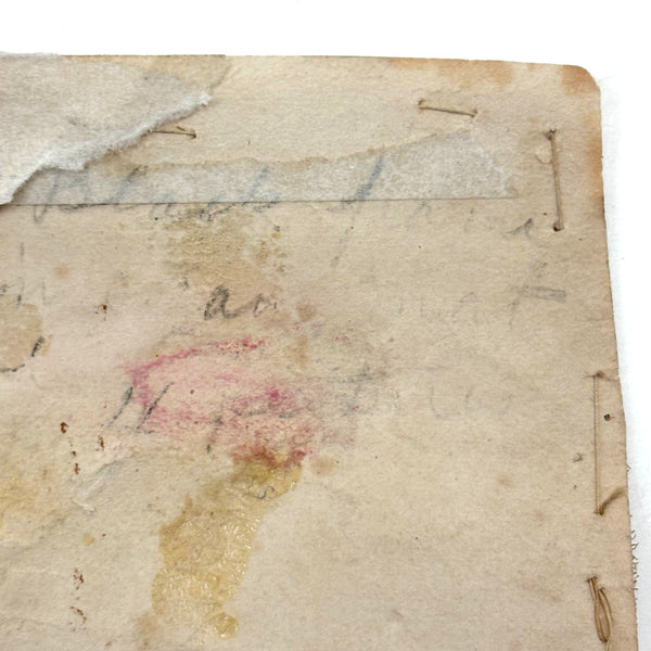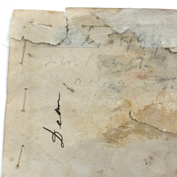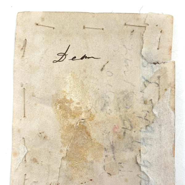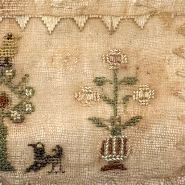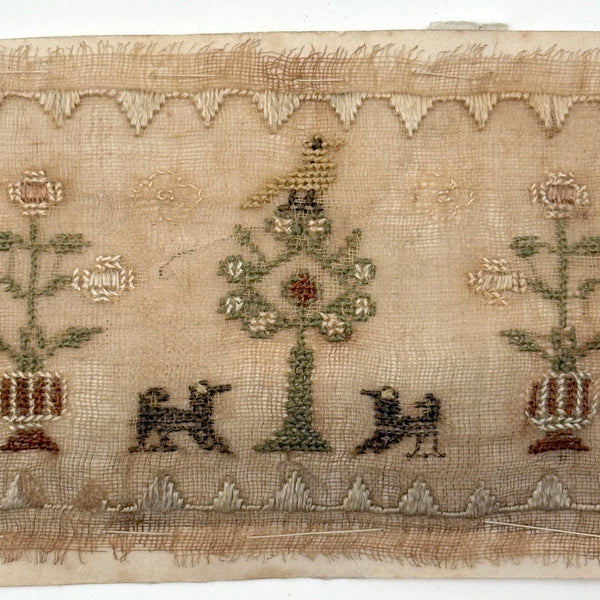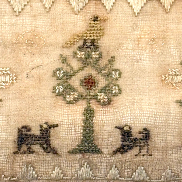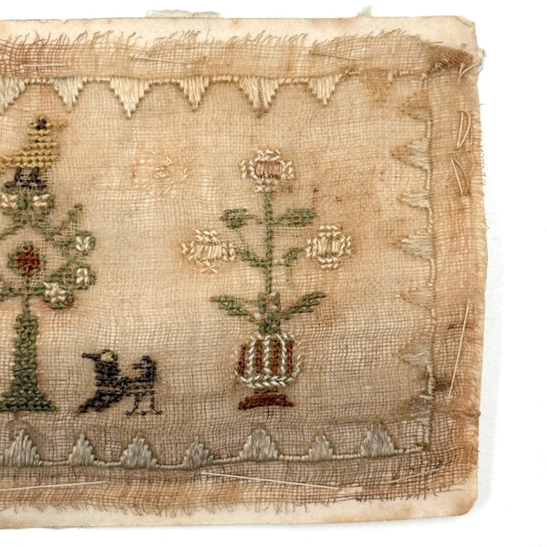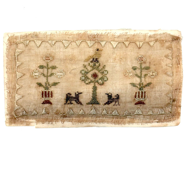 I paid close to what I'm asking on this one, which is sometimes the case--there are things I just need to become the steward of for a bit. How to resist these tiny tiny dogs? Or that tiny yellow bird atop its tiny tree? I could not. The scale of it makes me think of love tokens and early handmade rewards of merit, and indeed this is stitched to a paper backing, which looks to me to bear simply the word "Dear" in ink. That's what I see, anyway. Silk thread on ground, c. 1820s or so I believe. Tiny tiny stitches, special feeling thing.