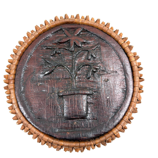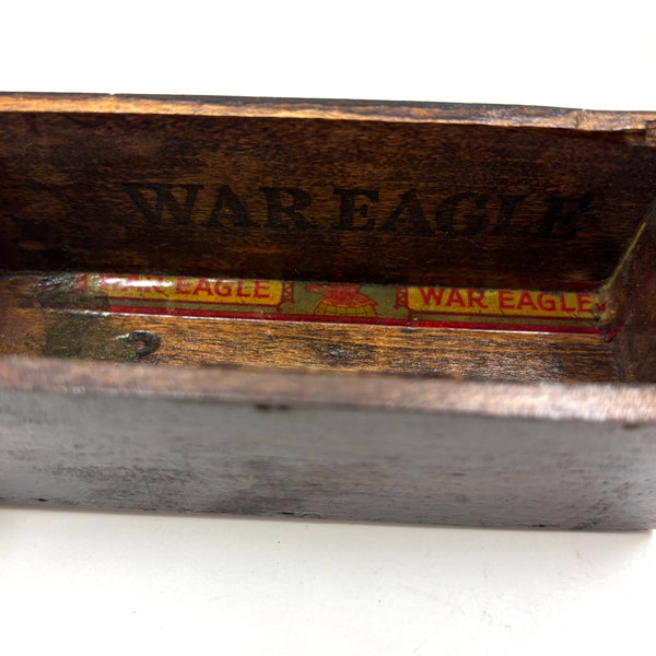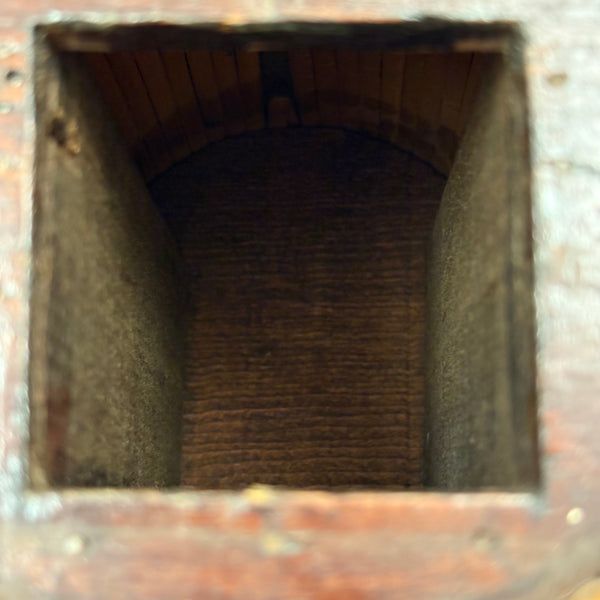 The basketry on that one was somewhat more elaborate, but it too had a drawer extending deep inside of it, and relief carving on the opposite end. The drawer here is made of cigar box wood, for "War Eagle" cigars to be exact. It is missing its pull, but is easy to pull out by the edges, and there is a small nail hole where a pull could be added. I especially love the relief carved urn of flowers on the opposite end myself, so would be inclined to display it that side up, with the drawer a secret hiding spot!