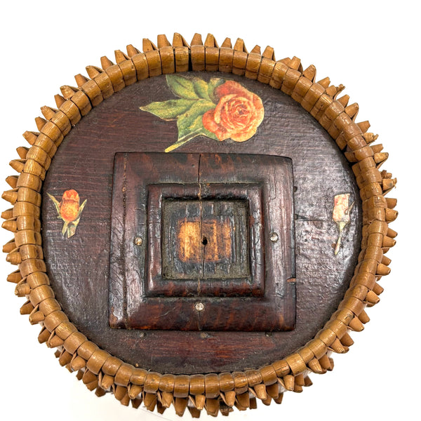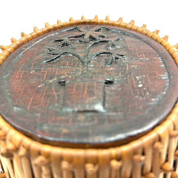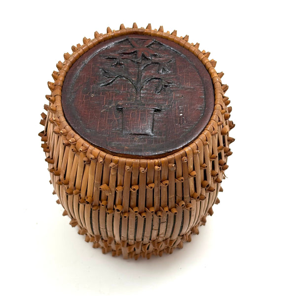 6 1/8" t x approx 5 3/4" widest. Carved ends of barrel (top and bottom) 3 13/16" d. The pull to the drawer is missing, as evident, and there is some irregularity to the curlique patterned weaving on the basket, probably with a bit of loss on one side, but it is quite stable and sound with no loose ends or bits.