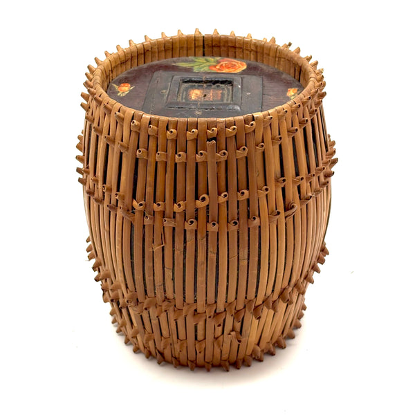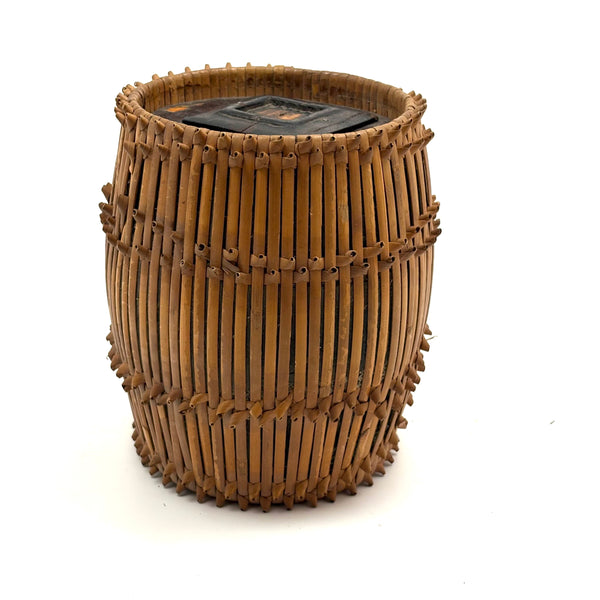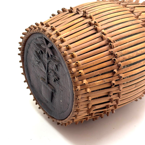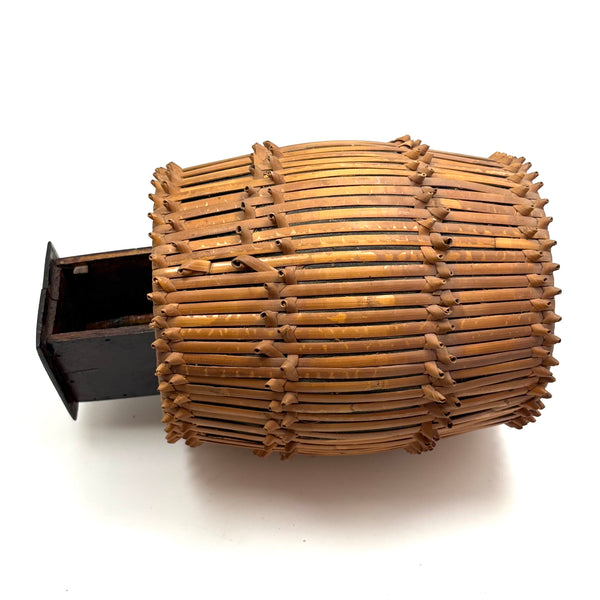 I have seen (and bought and sold) exactly one other basketry covered carved barrel of this sort, that one dated 1922 and from Maine. This one I found in PA, but I might bet it was made by the same person, or some small community of individuals--such a curious hybrid, and so particular, with the basketry seeming Native American, I'd speculate Mi'kmaq, and the rest very naive American folk/tramp art.