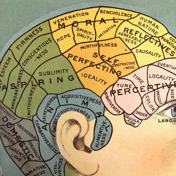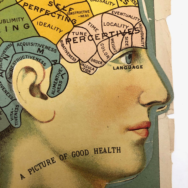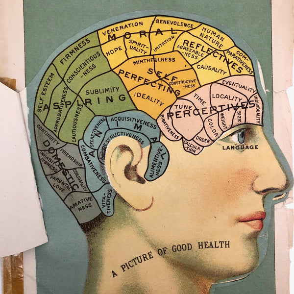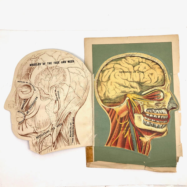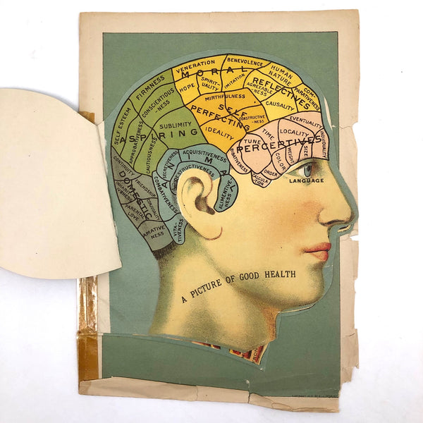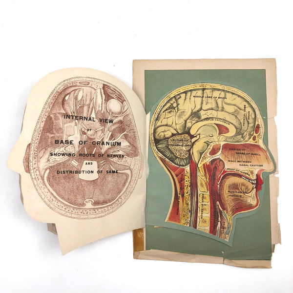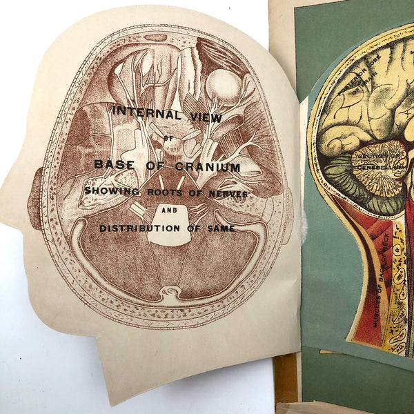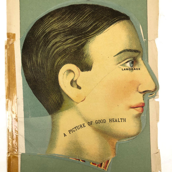 One of three early 20th century fold out anatomical illustrations, all found together but which I'm listing individually. I believe this one, and likely all of them, came from E J Stanley's "Library of Health," first published I believe in 1901, and again in 1916.  Five layers total here, from exterior of young man's face in profile, to phrenological diagram of the brain, to muscles, nerves, and skeleton.