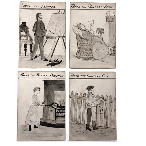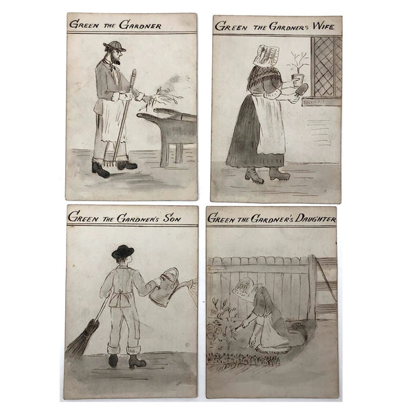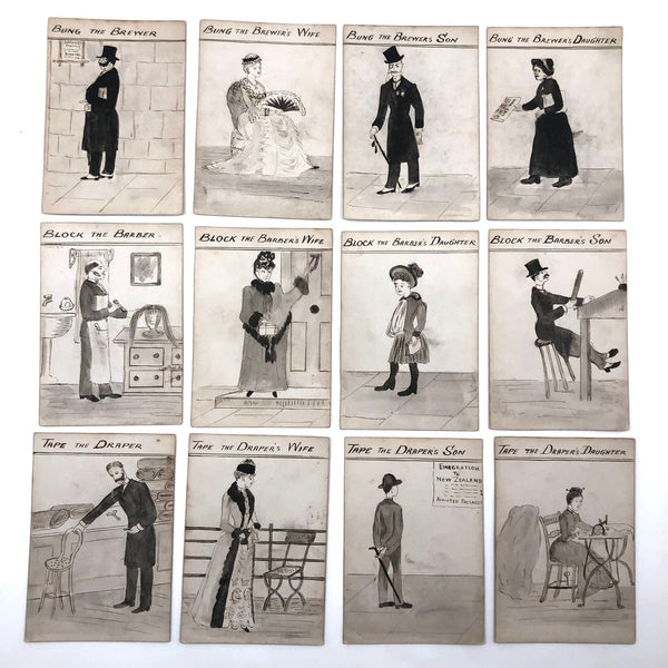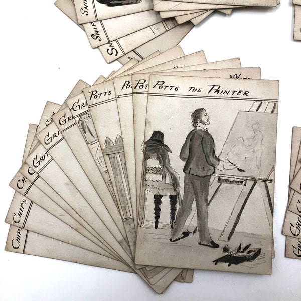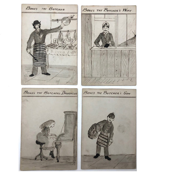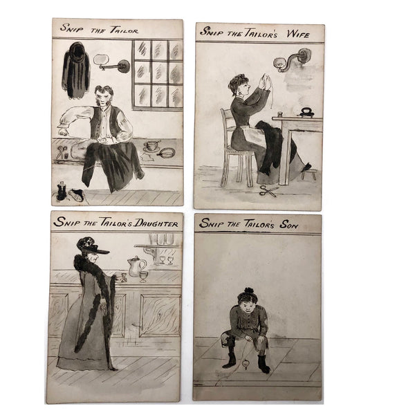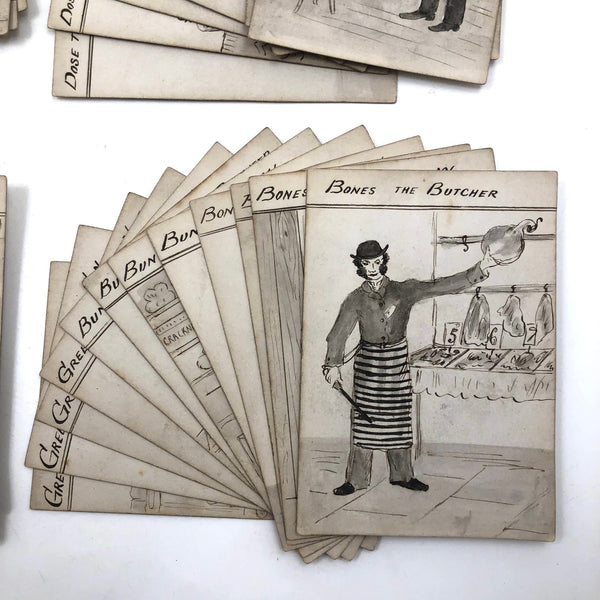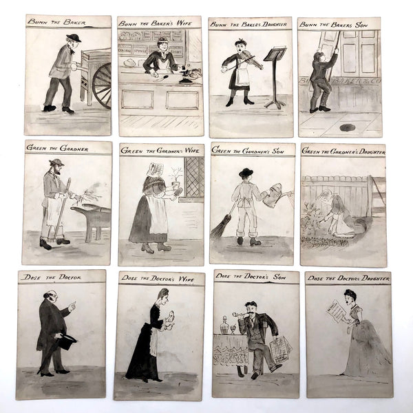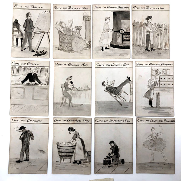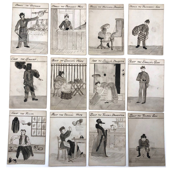 I search high and low for old hand-drawn decks of cards, which I pretty much never find! So I was thrilled to purchase this wonderful deck from a seller in England--48 oversized cards, all different, inspired by the popular "Happy Families" card game which dates to the 19th century (I believe these are late 19th or so.) The cards are divided into 12 sets of four, with each set including son, daughter, mother, and father, with the father representing a specific profession, i.e. Bones the Butcher, Soot the Sweeper, Potts the Painter, Tape the Draper. I've done a fair bit of searching and can't find a published deck that the imagery on these matches closely, though at least some of the last names were common to the game, which is played like rummy, with players trying to collect as many complete families as possible. Each one of these is its own terrific drawing, executed in ink and ink wash on heavy weight card,  with charming details, and humor, throughout. One of a kind, these would make for some very special game nights, or a marvelous set to frame.