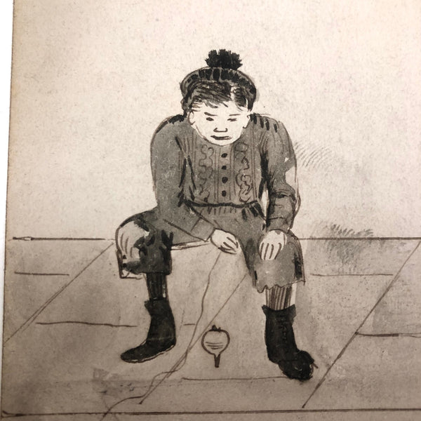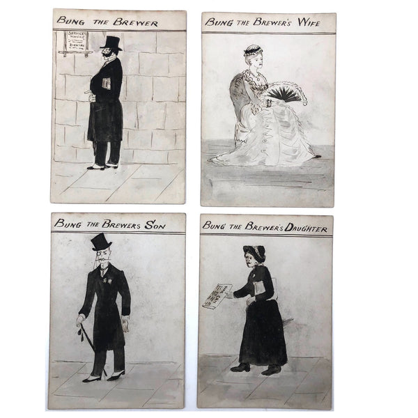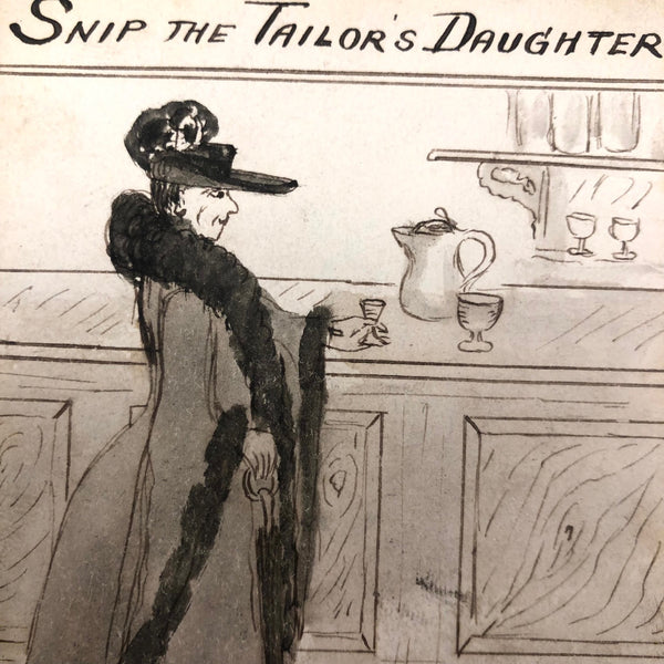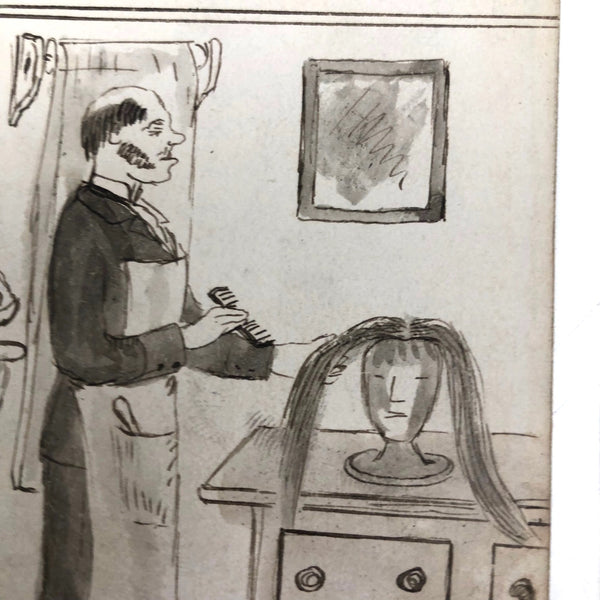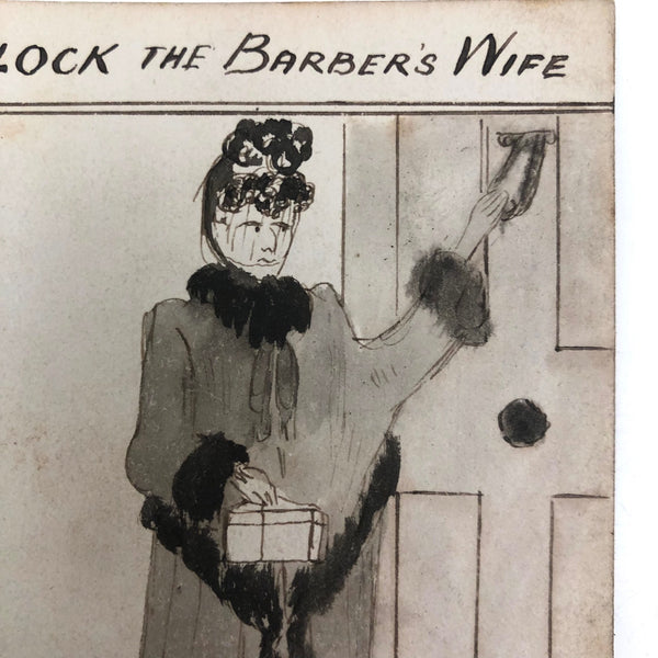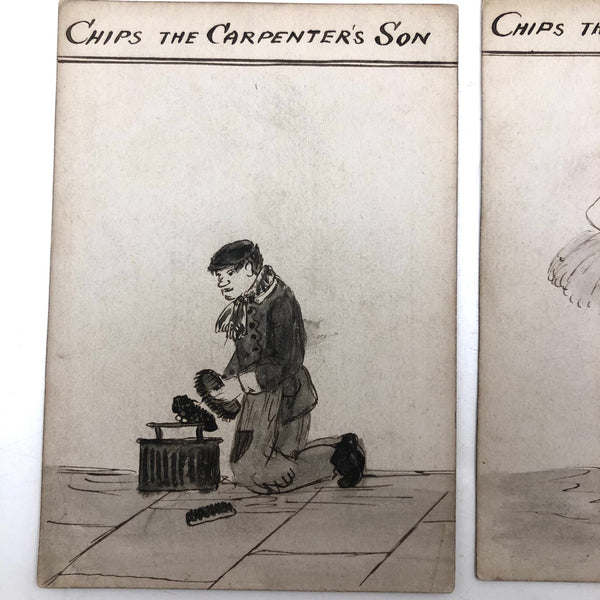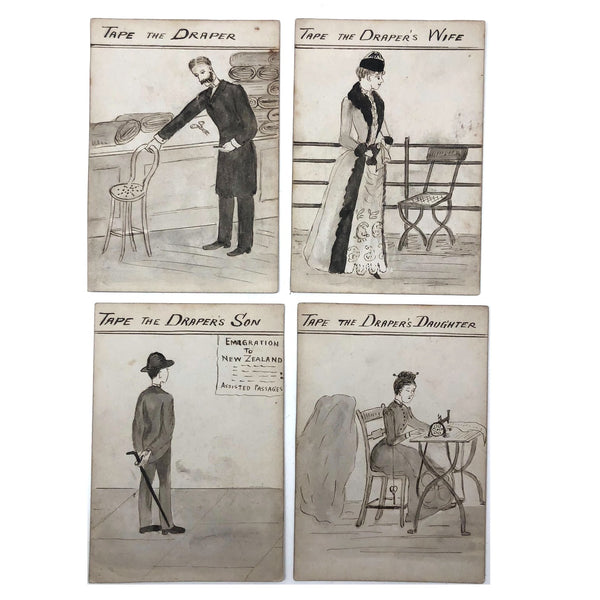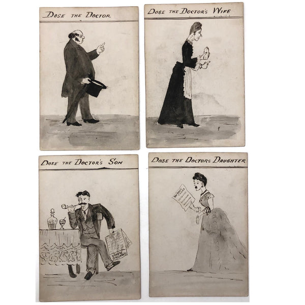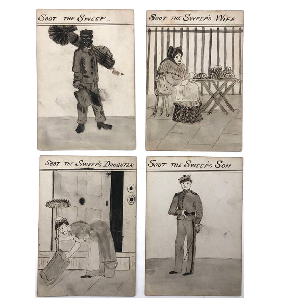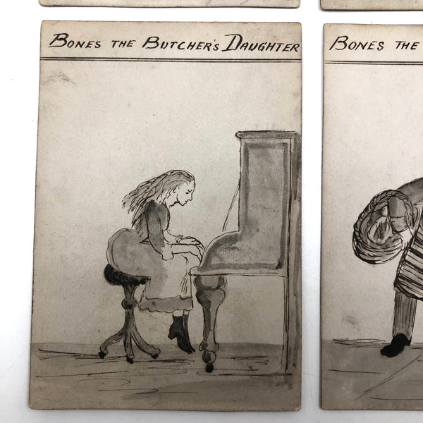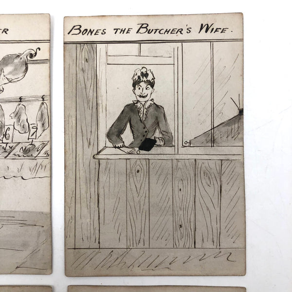 I search high and low for old hand-drawn decks of cards, which I pretty much never find! So I was thrilled to purchase this wonderful deck from a seller in England--48 oversized cards, all different, inspired by the popular "Happy Families" card game which dates to the 19th century (I believe these are late 19th or so.) The cards are divided into 12 sets of four, with each set including son, daughter, mother, and father, with the father representing a specific profession, i.e. Bones the Butcher, Soot the Sweeper, Potts the Painter, Tape the Draper. I've done a fair bit of searching and can't find a published deck that the imagery on these matches closely, though at least some of the last names were common to the game, which is played like rummy, with players trying to collect as many complete families as possible. Each one of these is its own terrific drawing, executed in ink and ink wash on heavy weight card,  with charming details, and humor, throughout. One of a kind, these would make for some very special game nights, or a marvelous set to frame.