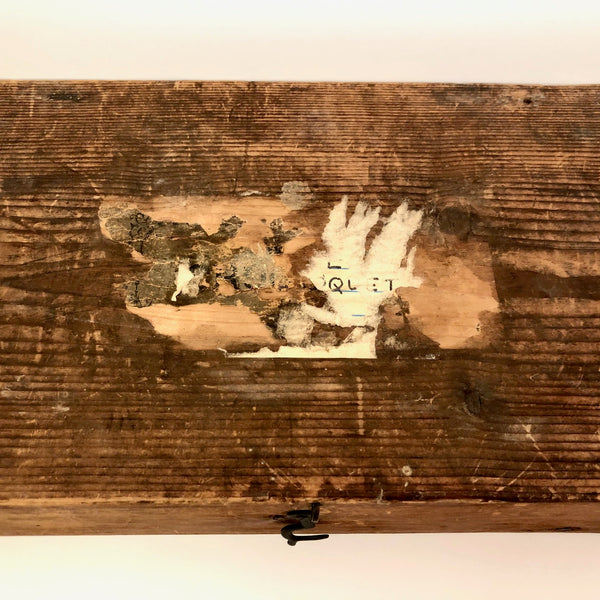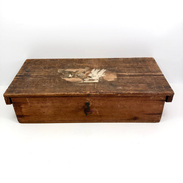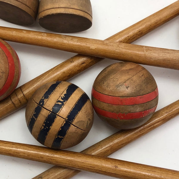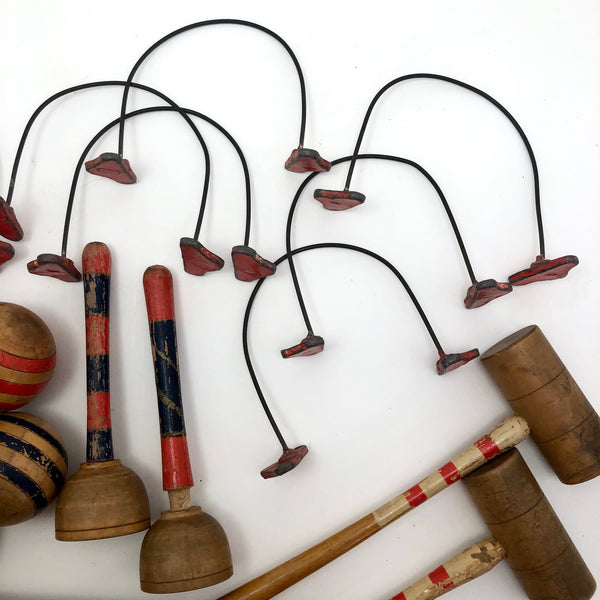 The original complete set could either have been for 6 or 8 players, so would have had at least a couple of more mallets, and may have included table clamps and a roll of canvas tape to provide a fence for the game. The striped paint on the handles of the mallets and on the posts is well worn, and there is a splint in one of the balls. The label on the lid of the box has been scraped away and Table Croquet printed in red marker on the box's back side. There is a hook on the front of the box that latches the lid to the box, but the latches on the back are missing (easily replaced with a couple of wire loops) so as of now the lid just rests on top.