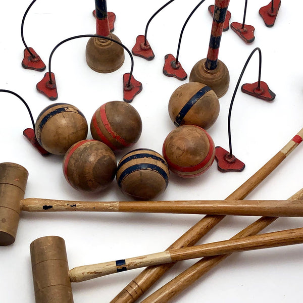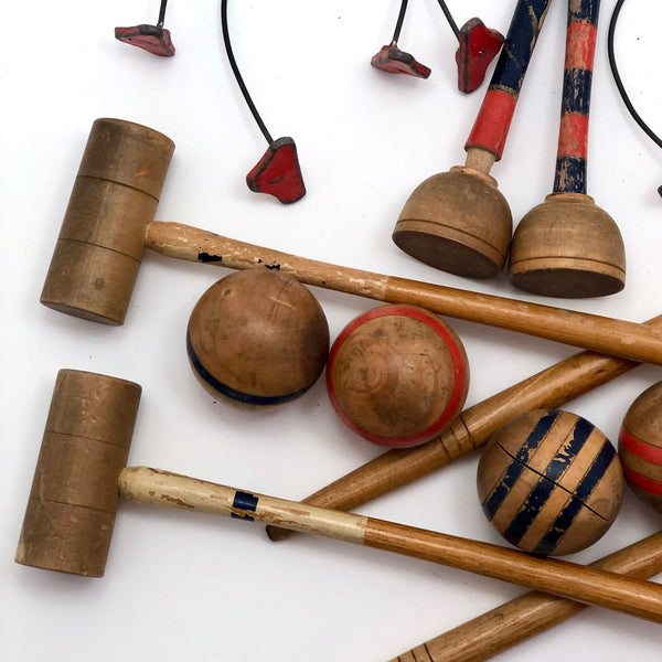 There are a few different companies that made lovely table croquet sets in the early 20th century very similar to this one, mostly British and French from what I've found, and I believe this one is French. Included here are 4 mallets, 6 balls, 2 posts, and 8 charming little wickets with red painted steel feet, housed in their original box. Ideal for playing on a pool table, this set has many years of use in it yet, though the individual components are so nicely crafted and great looking, I might just put them to decorative use.