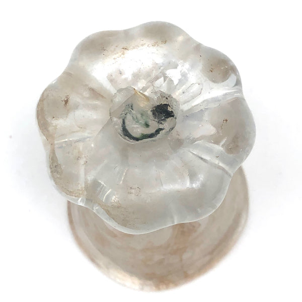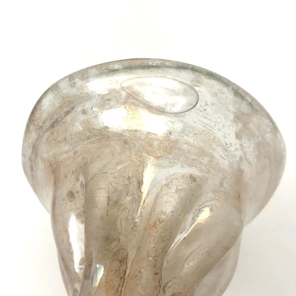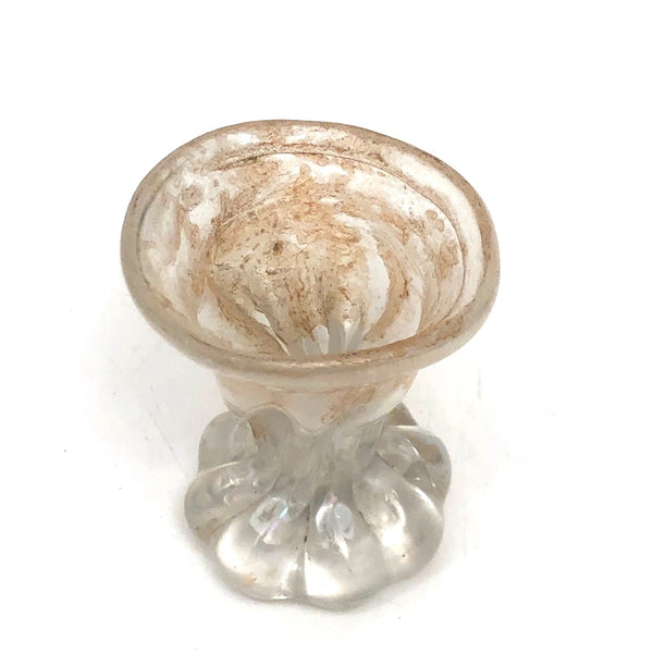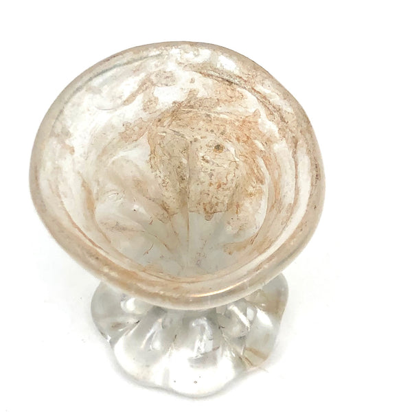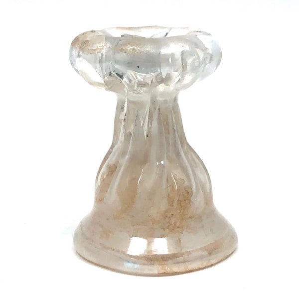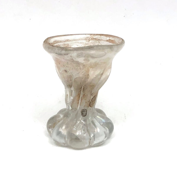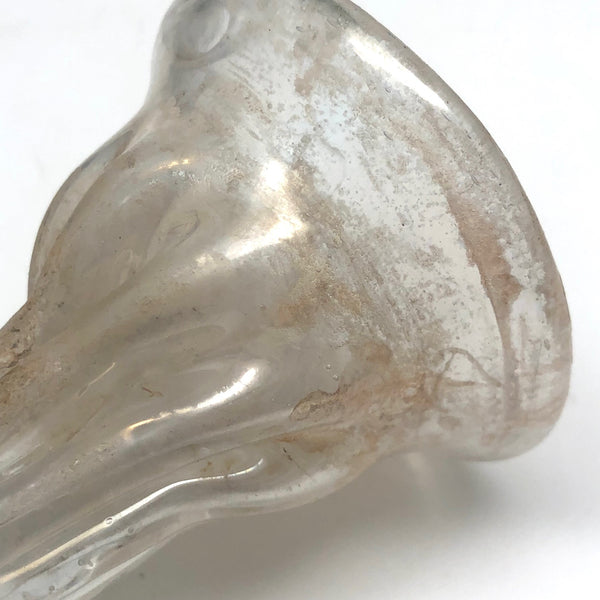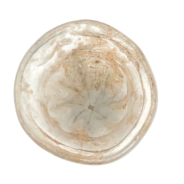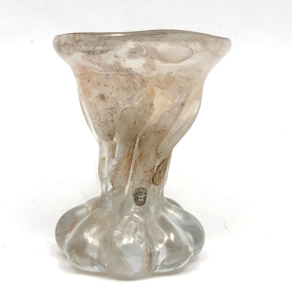 Yesterday was my day for early glass, finding the green and aqua bottle I just listed as well as this piece, which I purchased from a great dealer I buy from regularly. I love the wildly irregular form of the upper half with its fat rolled lip (and one giant air bubble) and then this bulb like base, reminding me of a head of garlic (and also looking a bit as if it should serve a tiny ice cream sundae!) I am not entirely sure of the age as it's an unusual form, but certainly it seems to be a very early piece, with lots of iridescence and encrustation to the upper half. Lighting does make a difference in how this piece shows; get it in the sunshine!