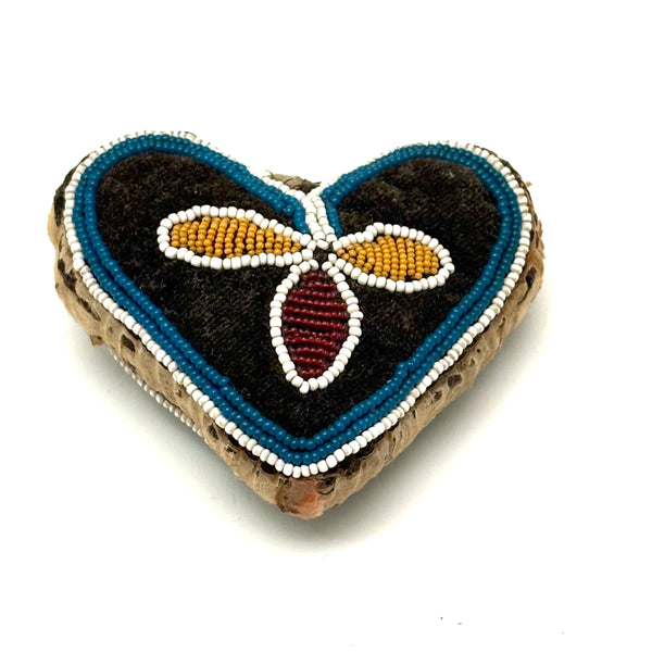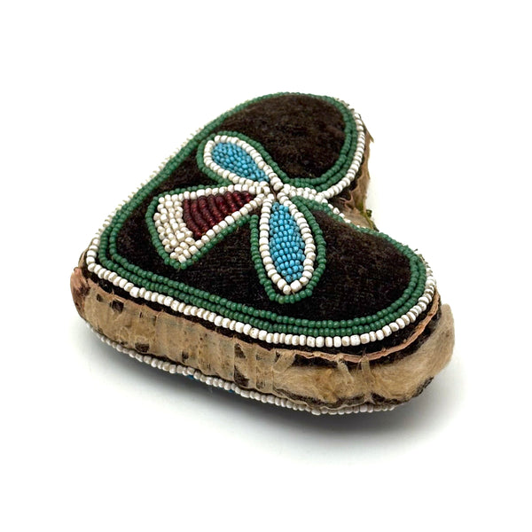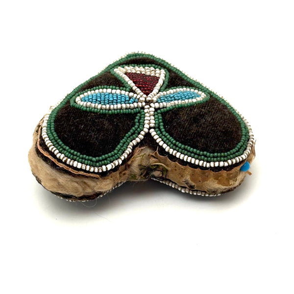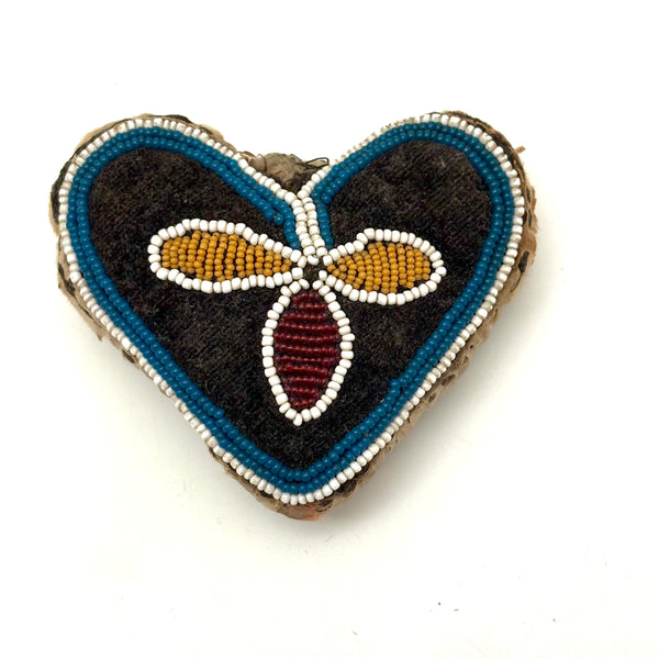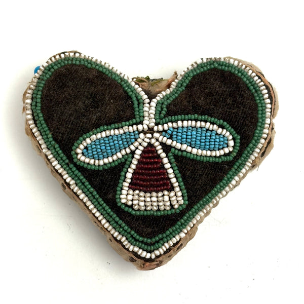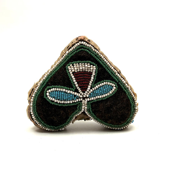 I don't think photos with no sense of scale do justice to this one--those beads are tiny, and the pin cushion relatively small, so it feels very fine in hand. And it is definitely an early one, c. 1850s I believe. There is a great blog devoted to early Iroquois (including Seneca) and Wabanaki pin cushions, including many heart shaped examples along the lines of this one, which I believe is Iroquois. Wear to the sides as evident--it does appear it was used!--but to my eye a very beautiful and special feeling thing, with different color scheme to the beading on either side.