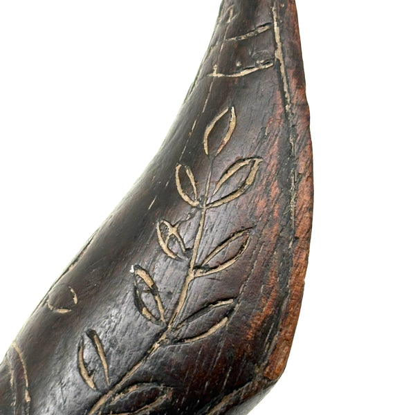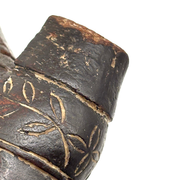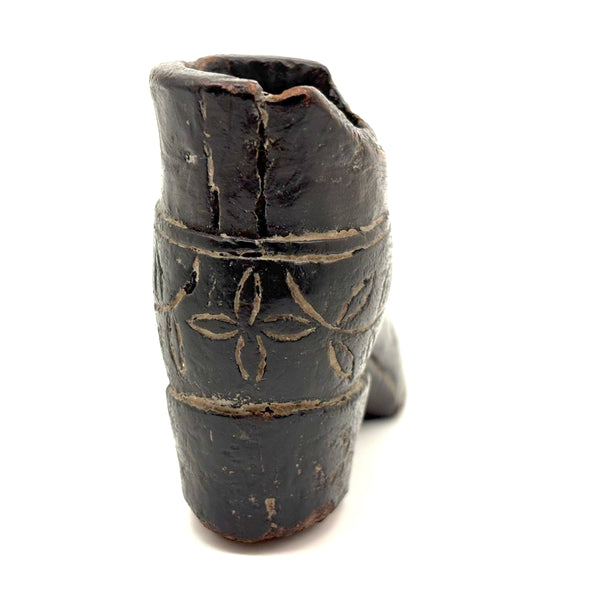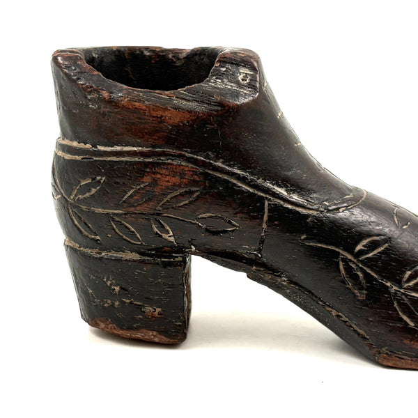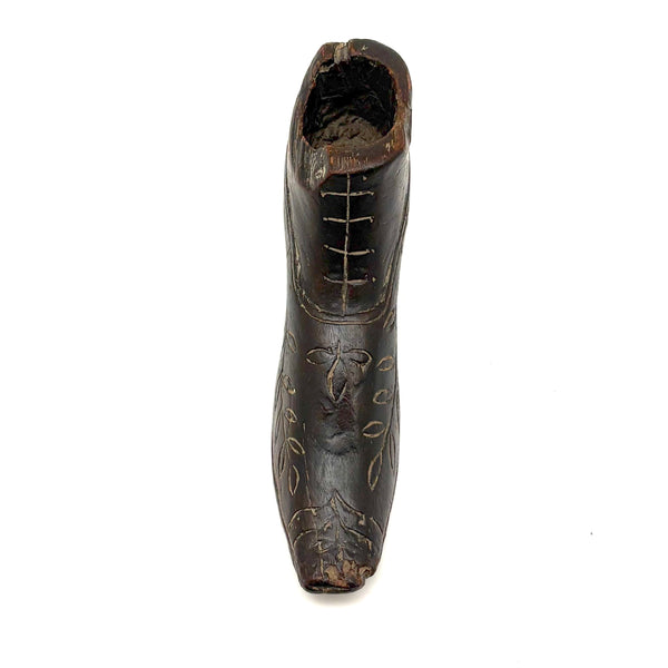 Another week, another carved shoe, because I love them in all of their variety, and who can ever have too many shoes? This is quite an old one I believe, early-mid 19th century, with extra long toe and great hand-carved vine design wrapping the sides and heel. It appears to have been stained/painted a very dark brown, which has worn in a a few spots so to see the wood underneath. I guess most likely made to hold a pin cushion, but I am not completely sure; there is a good bit of very old wear and loss (now very smooth, matching the patina on the rest of it) around the opening. Lots of character, great presence, and with well worn soles as if having done a lot of walking!