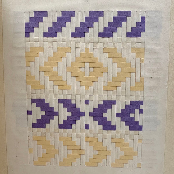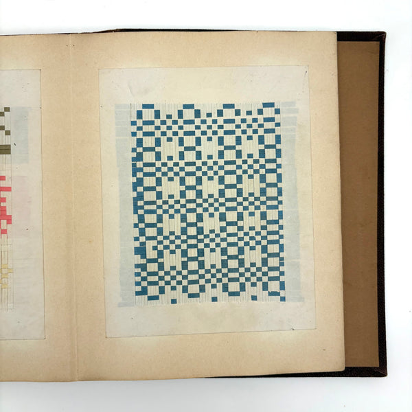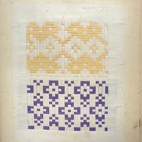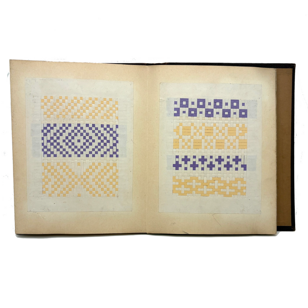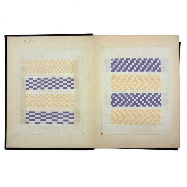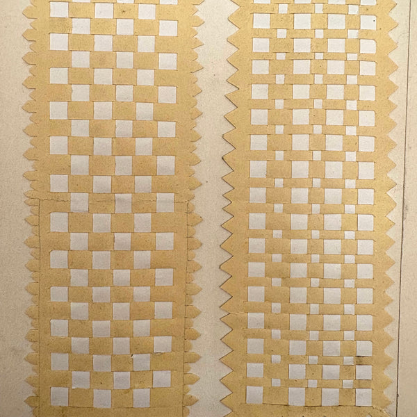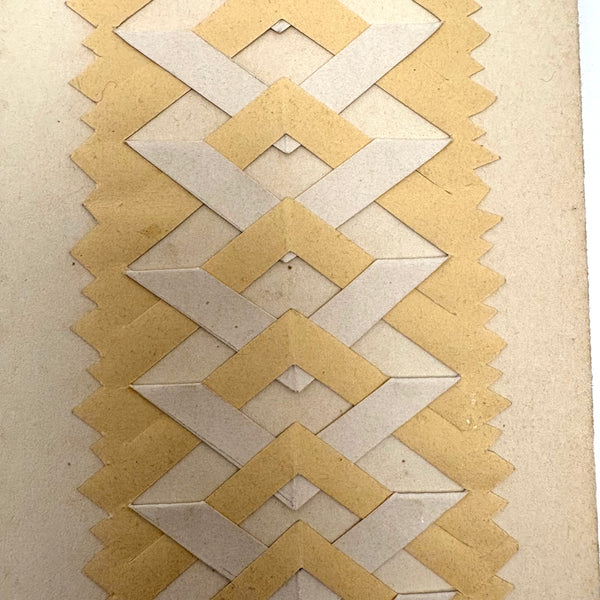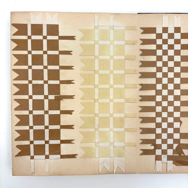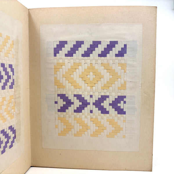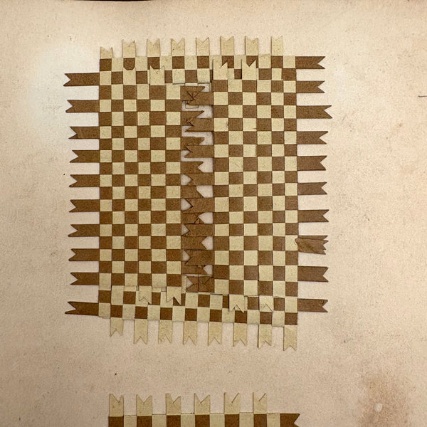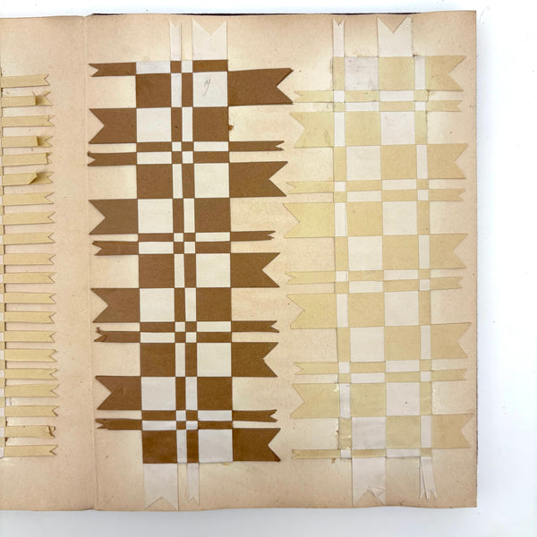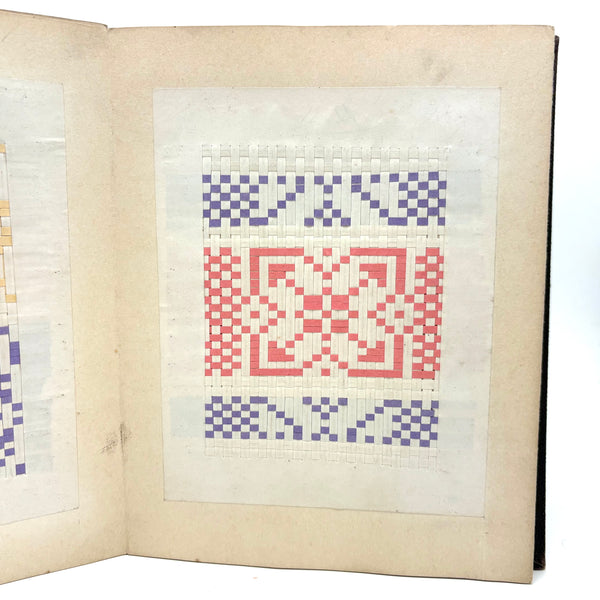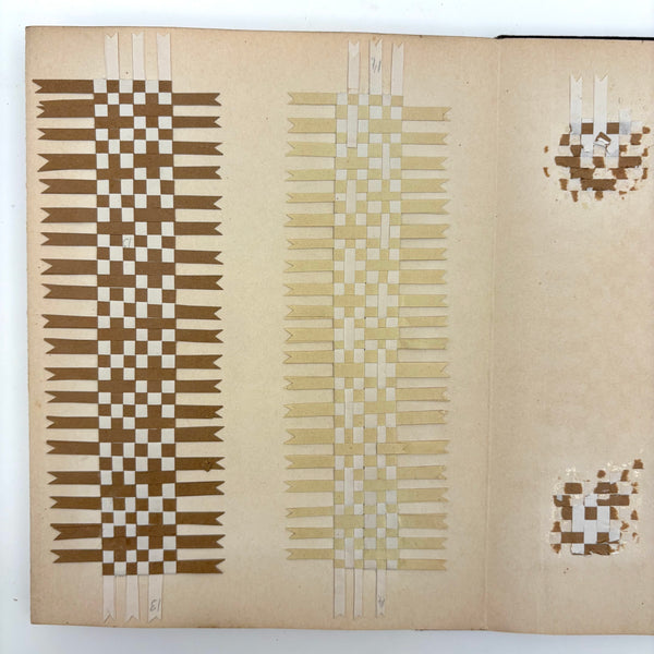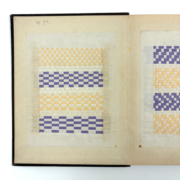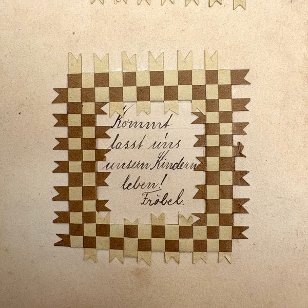 This is an accordion style album, made expressly for this purpose, filled in one direction with very fine paper full page weavings using colored paper strips for wefts woven through white paper warps. Running in the opposite direction are a variety of partial page weavings with vertical orientations woven in browns and yellows and creams, mostly two per page, and often with flagged ends to the paper strips. Among these is one tightly woven square with Froebel's motto written in cursive inside it: "Kommt, lasst uns unsern Kindern leben!" which translates to "Come, let us live for our children!". I've never seen that incorporated into one of these before, and for me, in addition to being quite an early and fine one, makes it extra special.