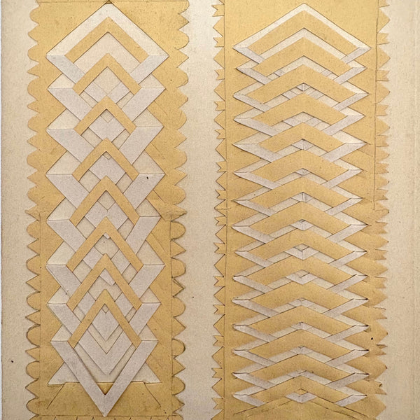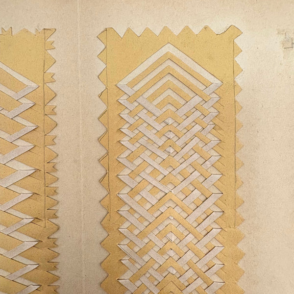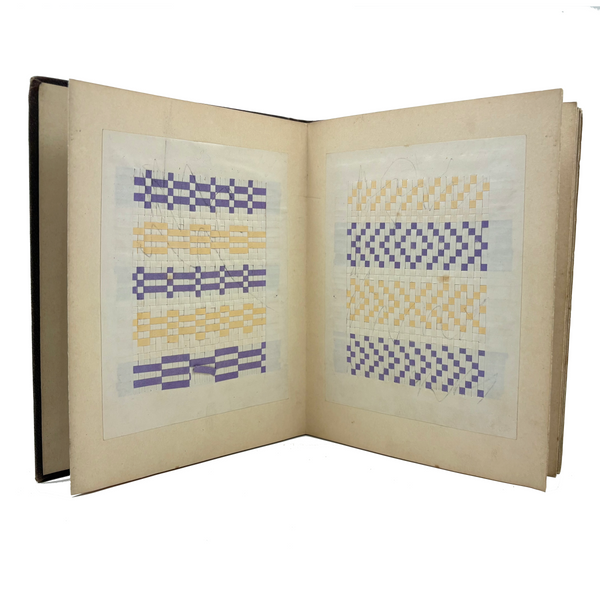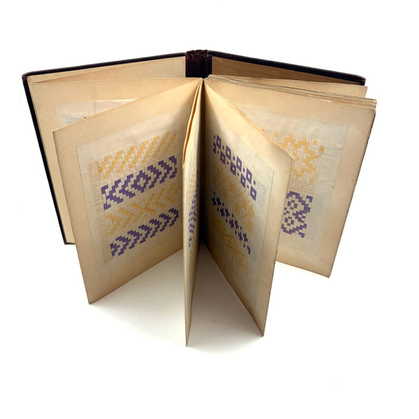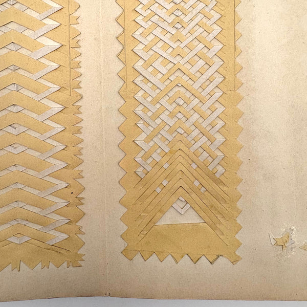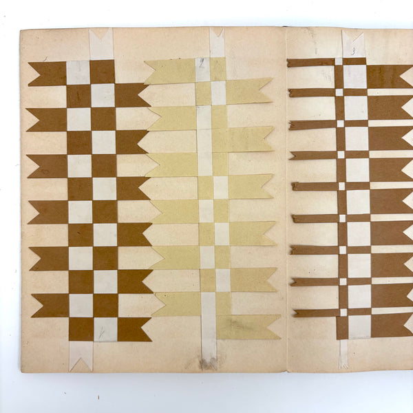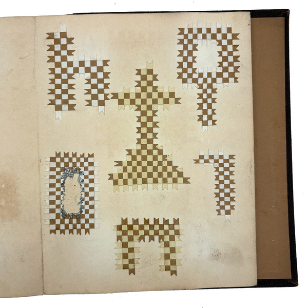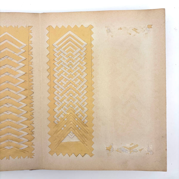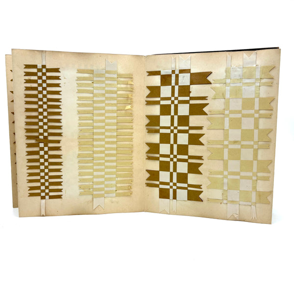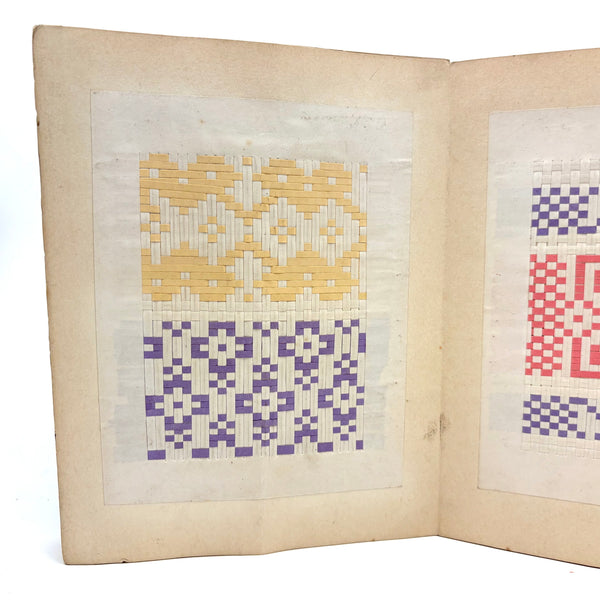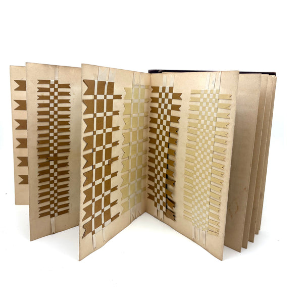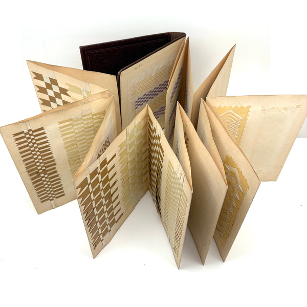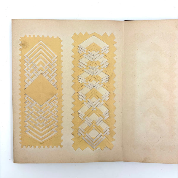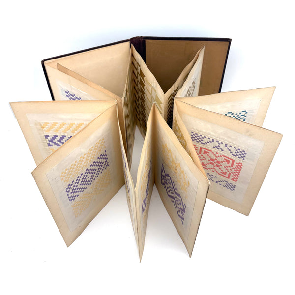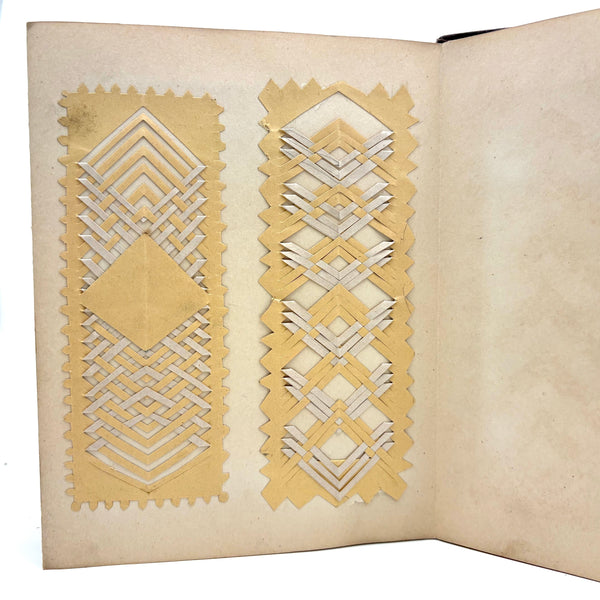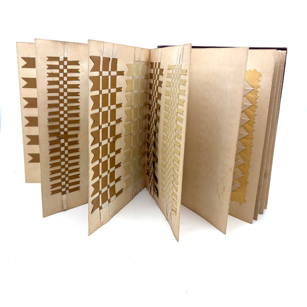 7 5/8" x 6". 30 faces of pages featuring paper weavings (weavings are adhered to both fronts and backs of pages in most cases). 9 accordion fold leafs plus covers. (4 pages of weavings per leaf) plus weavings on end pages. Overall very good antique condition, with a a few lost/removed works, as documented. There are a couple weavings where a few of the flagged ends of paper strips got folded; I've set them flat and put some weight on them to flatten them out; minor.