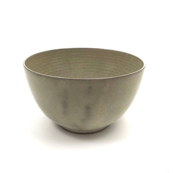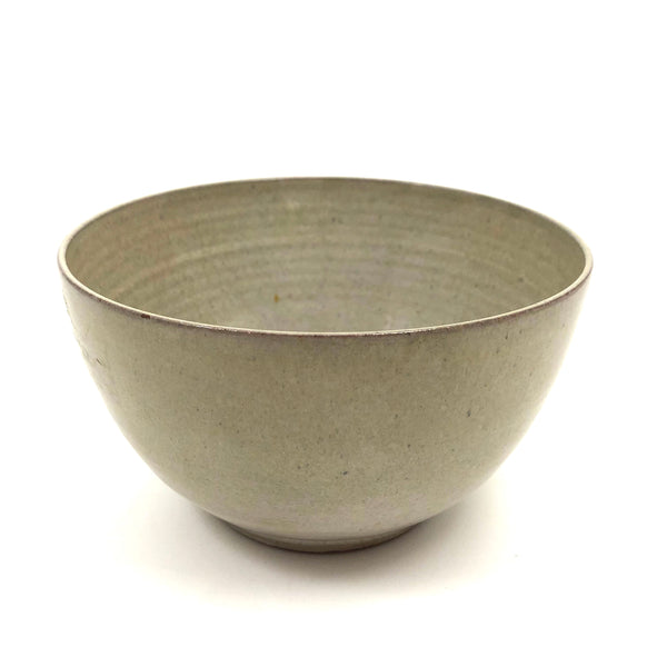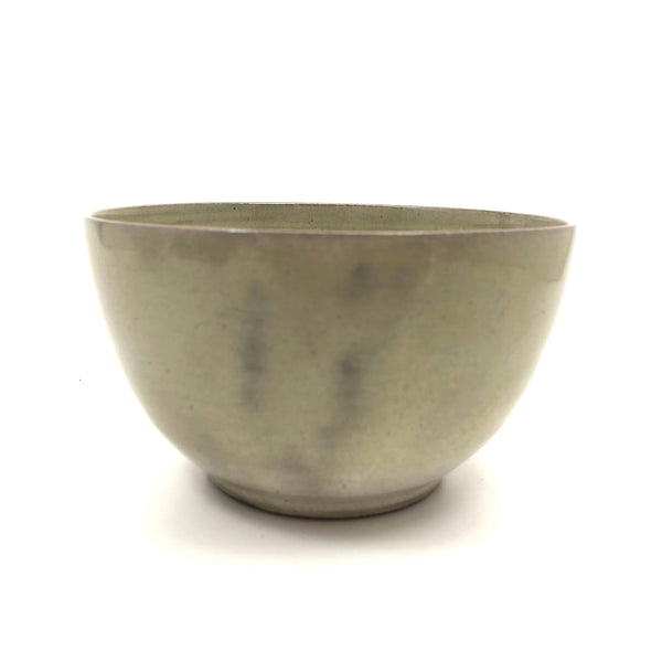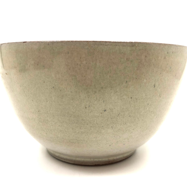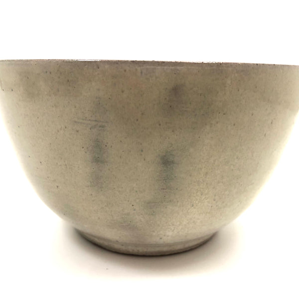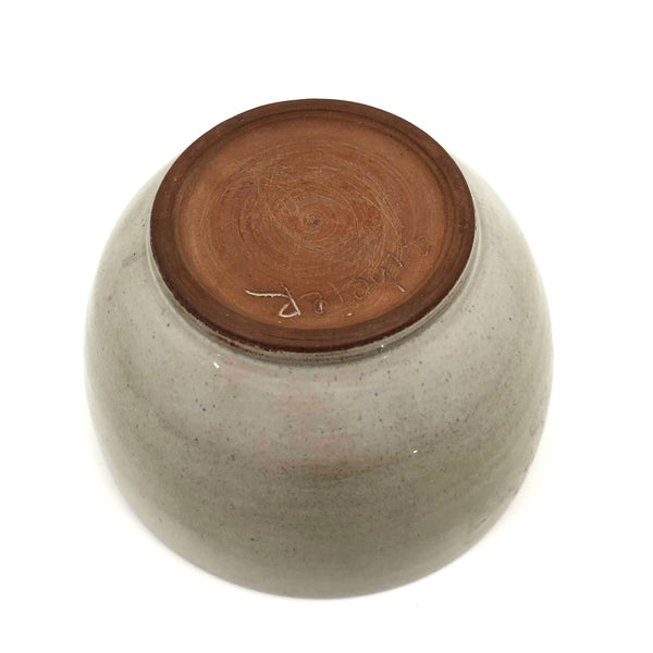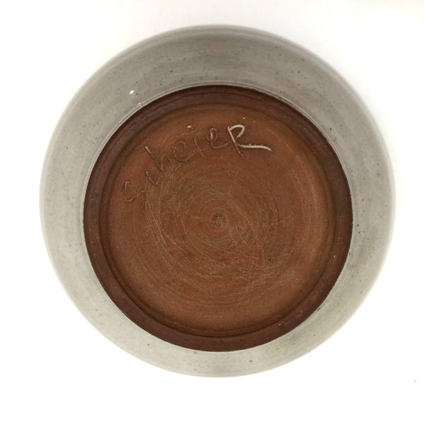 Because of their several decades spent teaching at the University of New Hampshire, Durham, pieces by widely renowned and influential ceramicists Edwin and Mary Scheier pop up more frequently around here than in most other places, this bowl indeed found in NH, not far from Durham. I believe it dates to the 1950s or so, signed on the underside, in excellent condition. Hard to photograph well, but the glaze is a sort of cream with a bit of gray in it, and with a darker gray flaming on one side that makes me think of 19th century smoke decoration. 5" d x 3" t