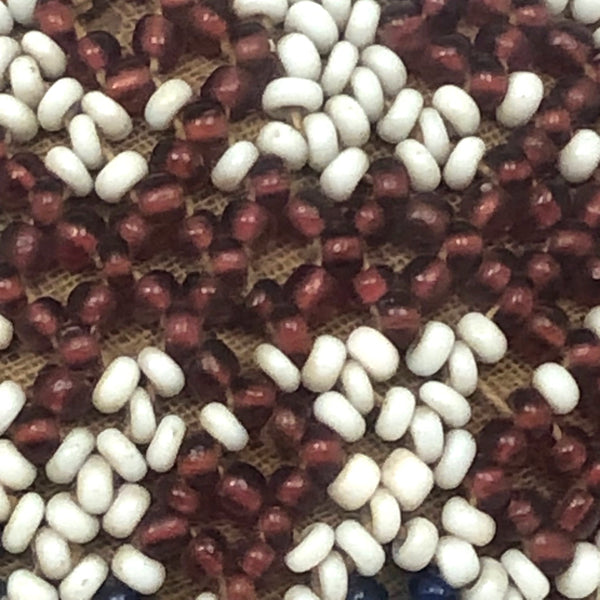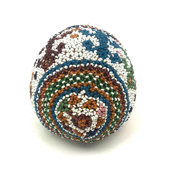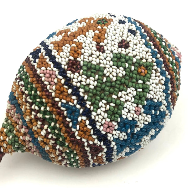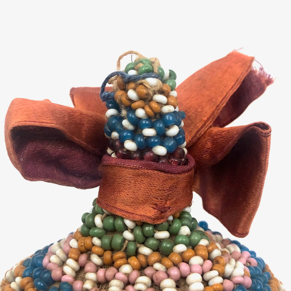 This one I had to use a google image search to identify, as I really could not place it; I purchased it for the beauty of the beadwork, reminding me somewhat of late 19th century Native American beaded birds and the like. I've learned that it is, I believe, from Gujarat, on the Western Coast of India, where beadwork is called moti bharat, and I think an example of "Shrifal"--beading covering a coconut (Indeed, the interior is hard and has the weight and feel of a drained coconut.) I have found a few other examples with similar patterning and fineness of the beading and beads themselves, making me believe it dates to the late 19th/early 20th century--and indeed the ribbon found tied around the top of it is an old one. From what I understand these were often part of a wedding dowry, and carried by women during auspicious occasions. This manner of beading was introduced to Gujarat in the 19th century by merchants, who imported venetian glass beads. There is a linen of what appears to be natural colored linen underneath the beadwork but to which the beading is not sewn onto.