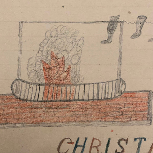 Way too early to think about Christmas I think, but it is starting to feel a bit cozy, and this is the last of the drawings I pulled from a wonderful notebook by Elmer S. Hill of Haydenville MA, so here is it. I really love that each of the four stockings hung by the fire is of a different size, and that the fire grate looks like a canoe, and I like that drawing of the chair best of all. Dated 1887 at upper right.
