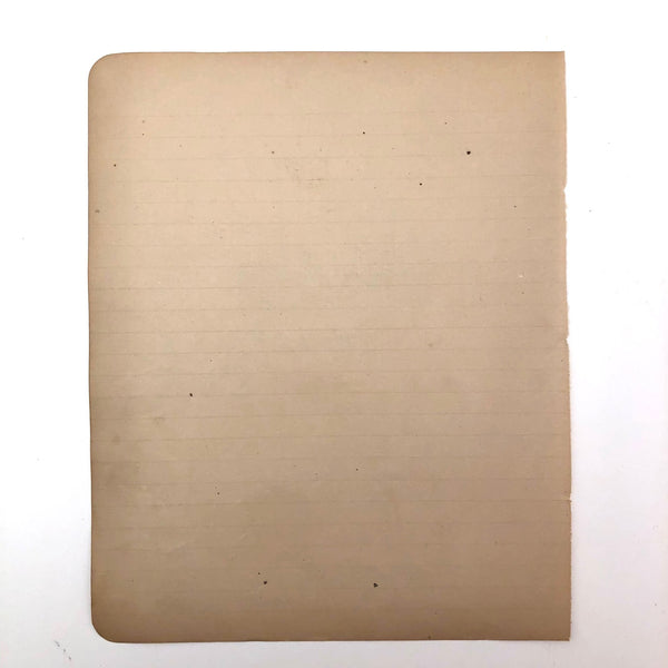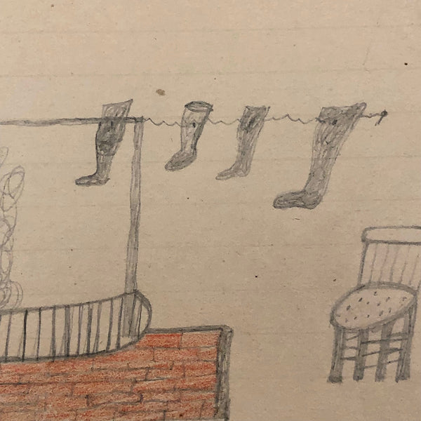 Paper measures 8 1/16” x 6 5/8”; pencil and crayon/colored pencil on faintly lined paper. Paper has darkened a bit over time, is a bit brittle, and shows a few light smudges and stains, but no foxing, generally clean and in good condition. Blank reverse.
