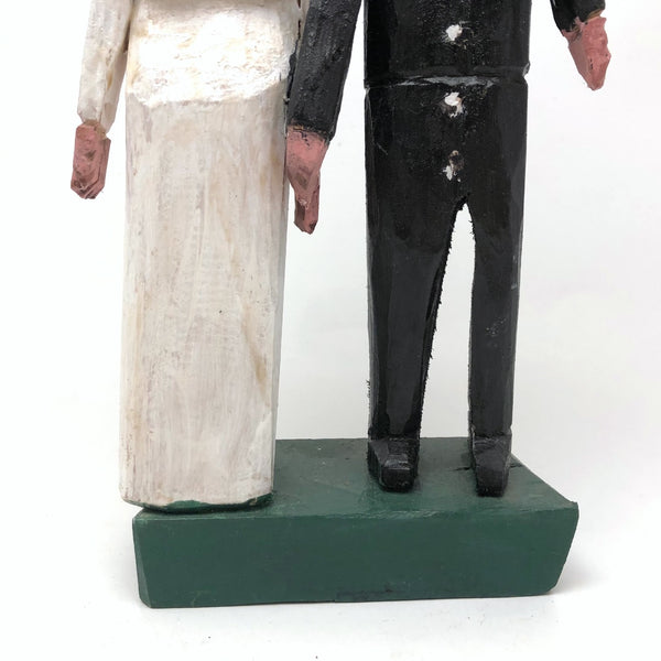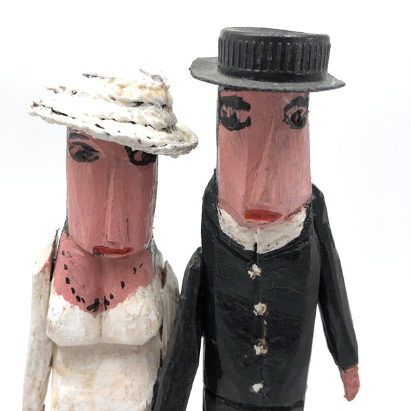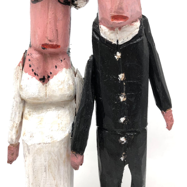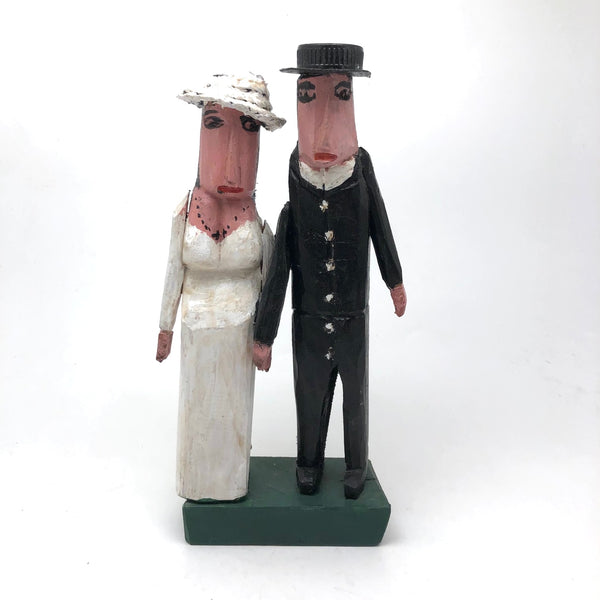 I've had a few pieces by Canadian folk artist Emile Bluteau (of Eastern Townships, Quebec) over the years, and find a great deal of humanity and charm in his work. Bluteau, also a collector, began carving and making assemblages from scavenged and salvaged materials in the late 70s, first portraying birds and then "the human condition in all its moods and shapes" as described by Lyle Elder, a documenter of Canadian folk and outsider art. More about Bluteau and additional images of his work here. This sculpture of a couple of their wedding day is emblematic of his work, with these two looking a wonderful combination of awkward and anxious--him perhaps a bit more eager and her perhaps a bit less than thrilled!