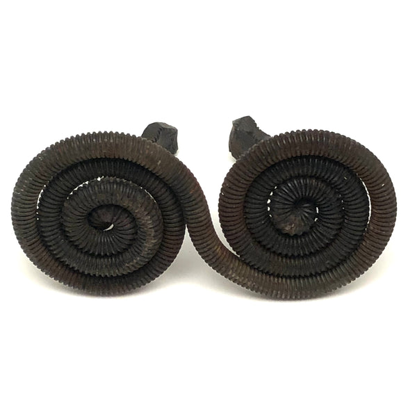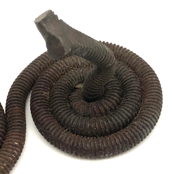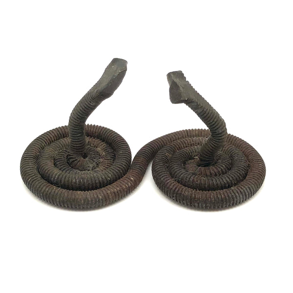 A two headed snake, or or a pair of them, together forever! Made from an old threaded iron rod-- as an end of day whimsy by an iron worker or machinist, or as a found object folk creation later on, I'm not entirely sure, but a great little sculpture either way, with some age to it for sure.