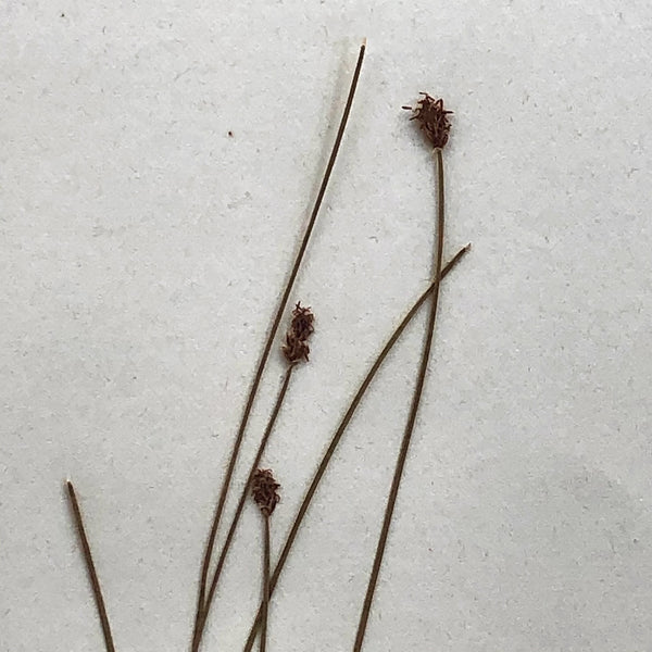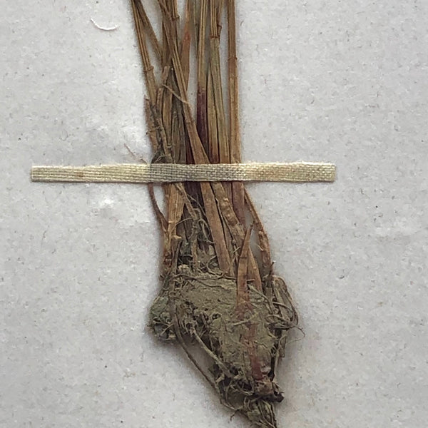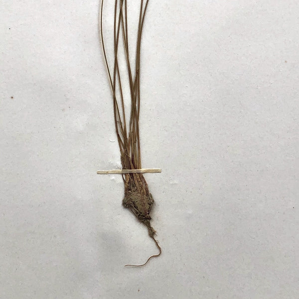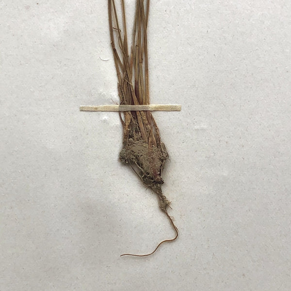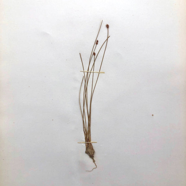 Eriophorum viginicum, also known as tawny cottongrass is a type of sedge, with a white cotton-like puffy head when mature. I believe this is a young one, and beautifully tethered and preserved,  like a wispy line drawing. I especially love that the roots are still tightly holding a clump of dirt some 140 years later!
