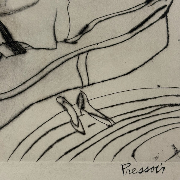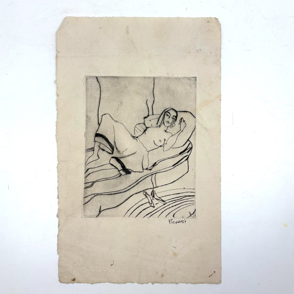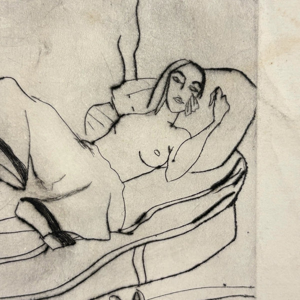 I knew nothing of Esther Estelle ("Stella") Pressoir (American, 1902-1980) when I found this signed etching along with several other works by her at Brimfield (an ink drawing also listed today, and a few more to come), but what a delight it has been to learn a bit about her, and Stella's star is most definitely on the rise. Assistant Professor of Theory and History of Art and Design at the Rhode Island School of Design Suzanne M. Scanlan's recently published Esther Pressoir: A Modern Woman’s Painter situates Pressoir, a queer woman, and her work within the emerging modernist art scene of the early 20th century, both in America and abroad, and situates her in relation to trailblazing contemporaries such as Alice Neel and Florine Stettheimer. Coming of age in the 1920s, Pressoir is presented as casting off the societal expectations of a working-class immigrant family in New England to move through the studios, galleries, and nightclubs of New York and then to have embarked on a 18,000 km bicycle trip across Europe in 1927, where she kept a daily journal and made hundreds of sketches, developing an expressionistic style that straddled figuration and abstraction. Included among her prolific output were provocative renderings of the female nude that challenged historical models, including self-portraits and intimate depictions of her longtime model, muse, and lover, a black dancer from Harlem named Florita. Here's a link to a 2024 article in Hyperallergic by Bridget Quinn about Pressoir.