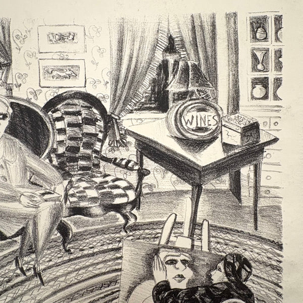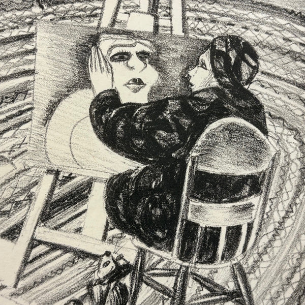 A copy of this signed lithograph is held in the collection of the RISD museum (Pressoir was a RISD alum) and was presented along with a number of her works as part of the exhibition Art and Design from 1900 to Now in 2024. I think it is a marvelous print, showing Pressoir at home and at ease at her easel, artist and subject both, with wonderfully specific and full of life details everywhere, down to her cat at her feet and open books strewn across the floor.