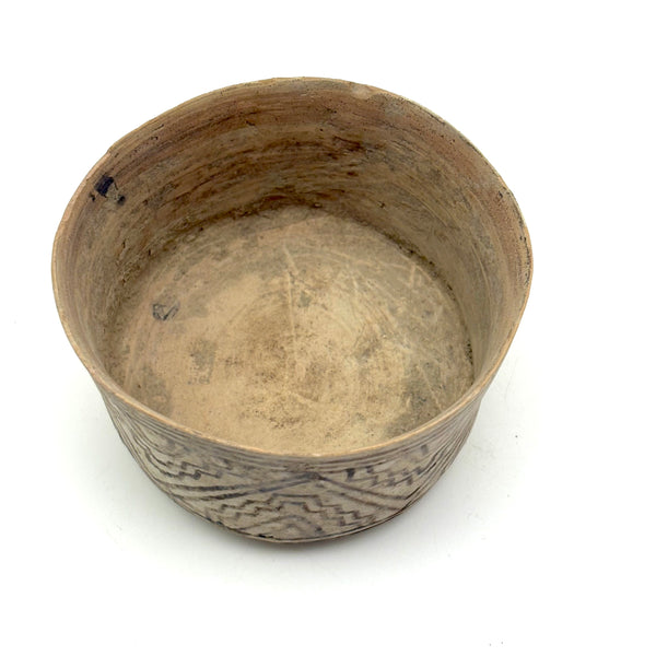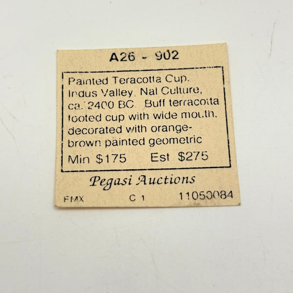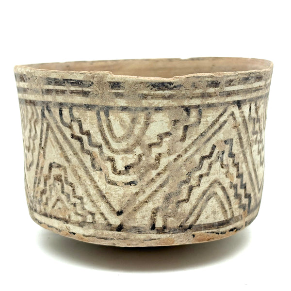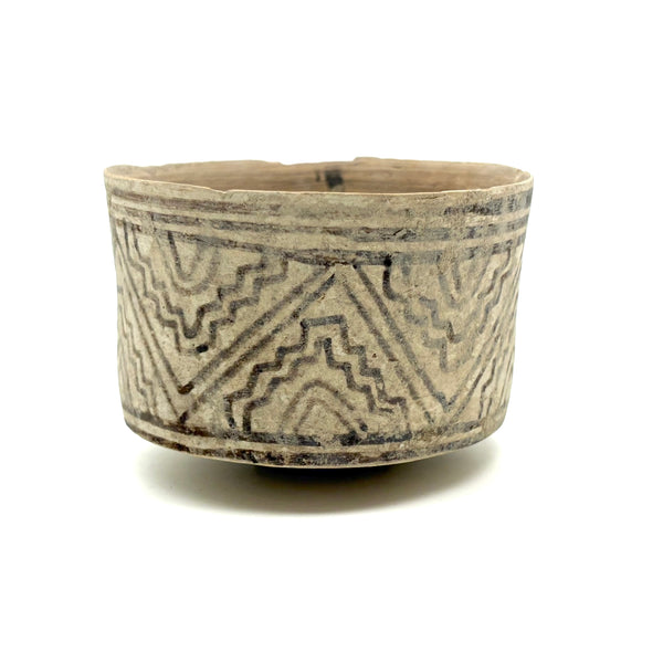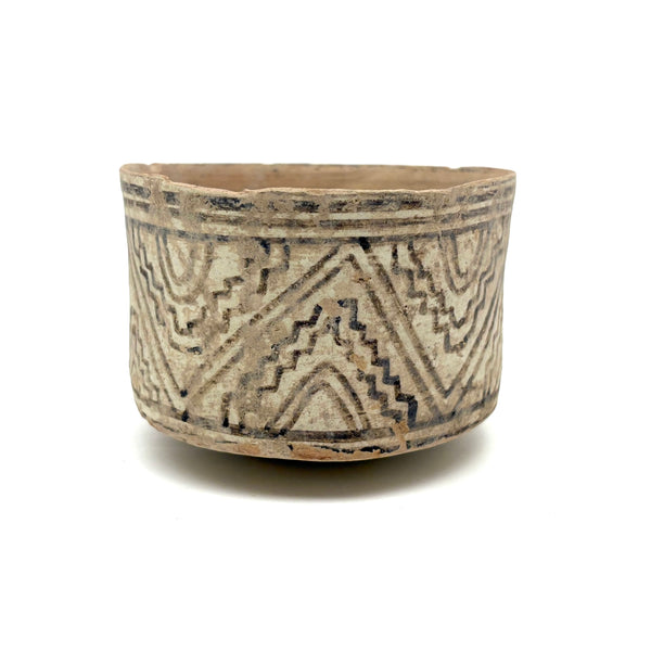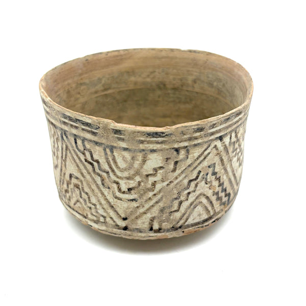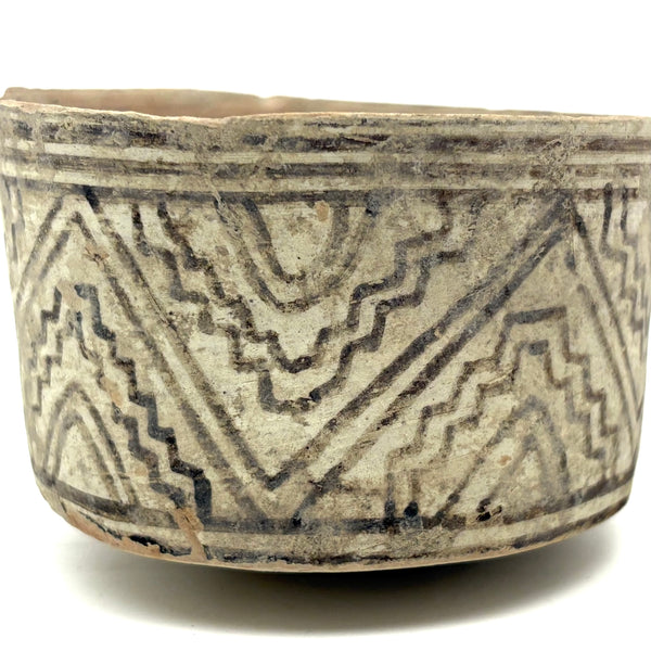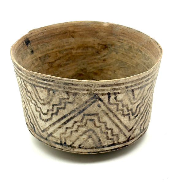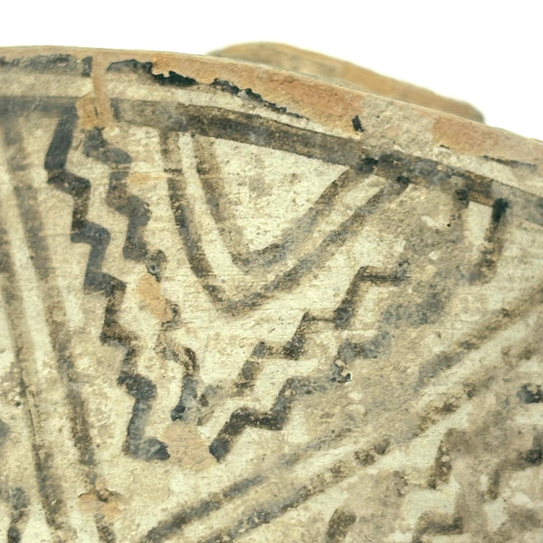 I purchased this from a favorite antiques shop just over the NH border in Vermont, one of the owners of which has a particular devotion to ancient things, and from whom I've bought a few small wonders--as much for my own joy to spend a little time with as to sell, but a seller I am (though I'll be very glad to keep this one.) It is a c. 2400 BC decorated terracotta bowl from the Amri-Nal culture, known for its distinctive pottery, including light buff "fine ware" with linear geometric motifs painted in dark brown and black; this is really a quintessential example. Very thin walled, it is almost translucent, and very light in weight--an ethereal and for me rather magical feeling thing, and I really can never quite wrap my head around the possibility of holding such an ancient thing in my hands. This piece came from a private New England collection, and with an old Pagasi Auction sale slip included. Glorious.