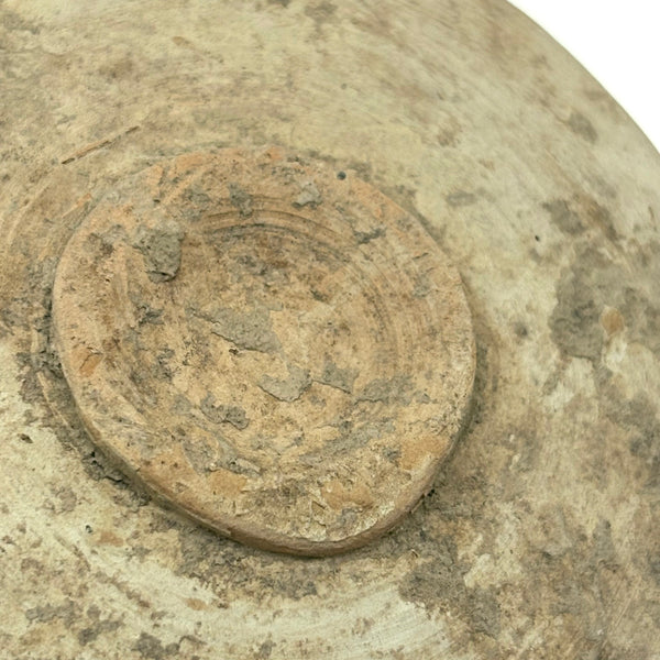 3 1/4" widest diameter x 2" tallest (form has a bit of irregularity to it.) Beautiful ancient condition (!) with a bit of loss to the surface and to the rim, but not much. The foot is just slightly irregular too, meaning a tiny bit of lean depending on how positioned, but most ways it sits and shows square.